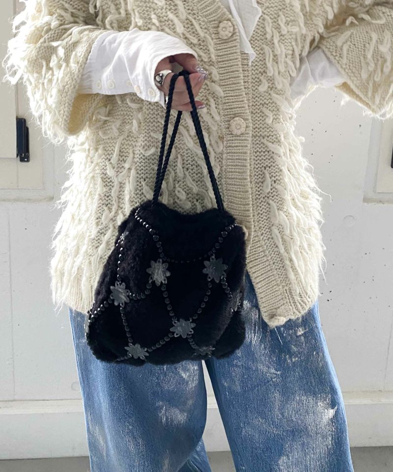 みっしりとした羊風のフェイクファーに、オリジナルのお花風のパーツとビーズを組み合わせたネットが魅力的なショルダーバッグ。