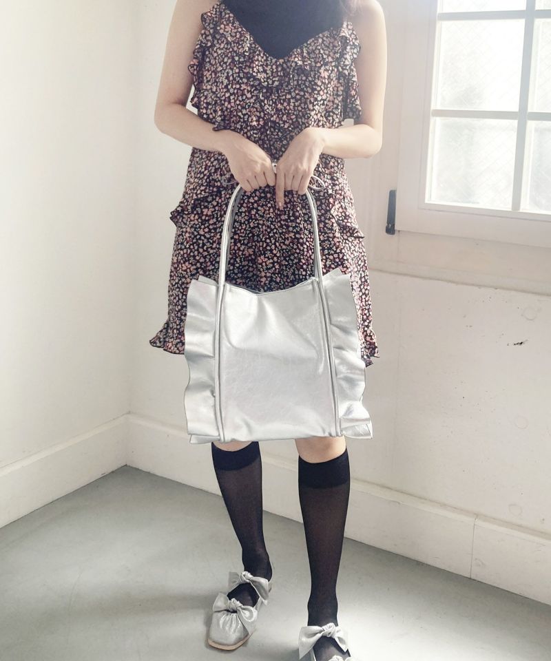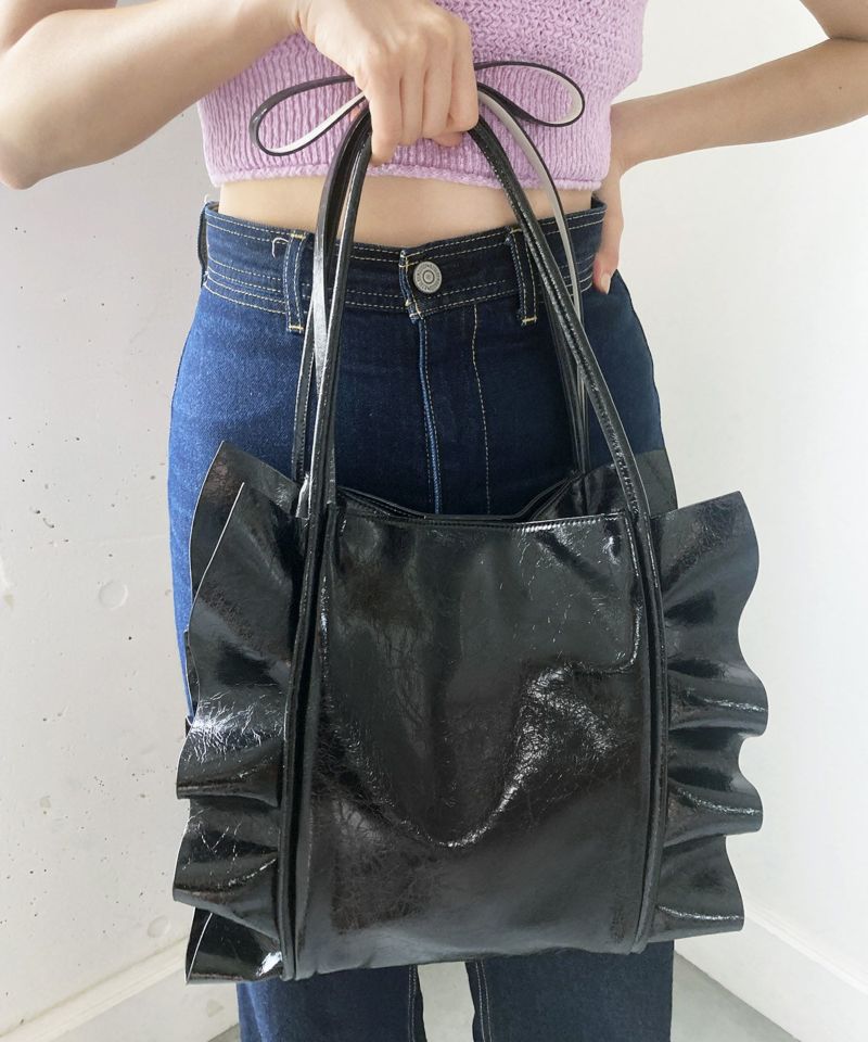 フリルをあしらった、使いやすいミドルサイズのトートバッグ。 クラッキング(ひび割れ)したようなラフな雰囲気のエナメル素材を使用しています。 太マチx横長のフォルムと、楽に肩掛け出来る長めのハンドルで実用性も◎ 肩にちょこんと乗って見えるリボンモチーフは取り外し可能です。 ハンドルの付け根に取り付けるのもオススメ。