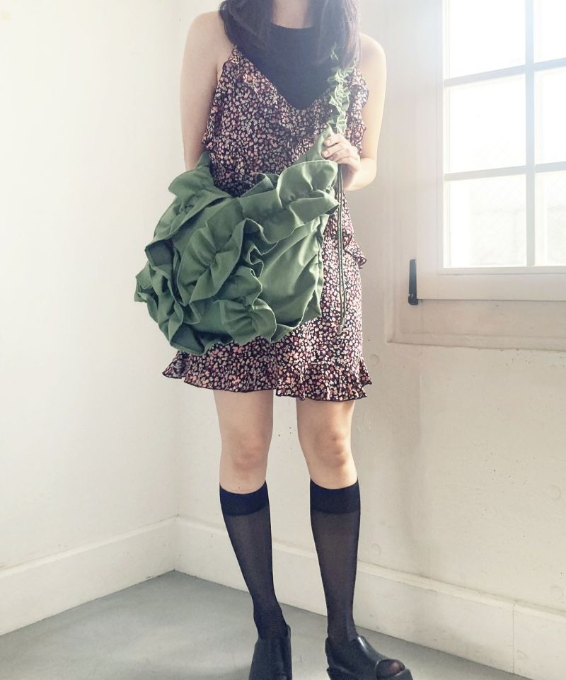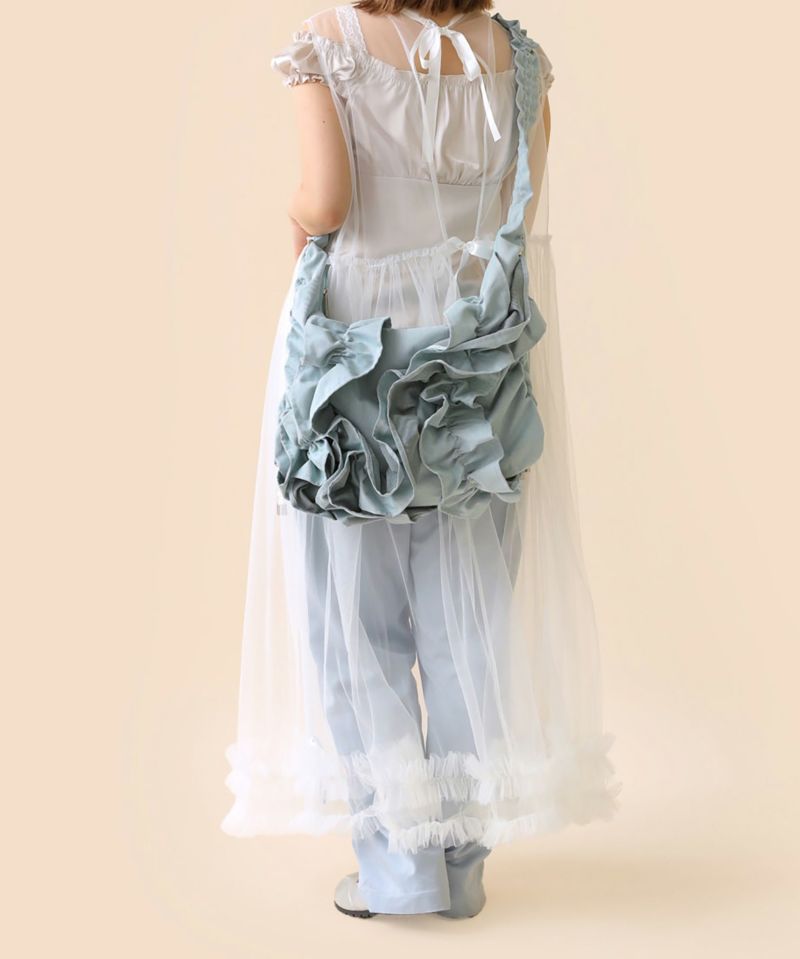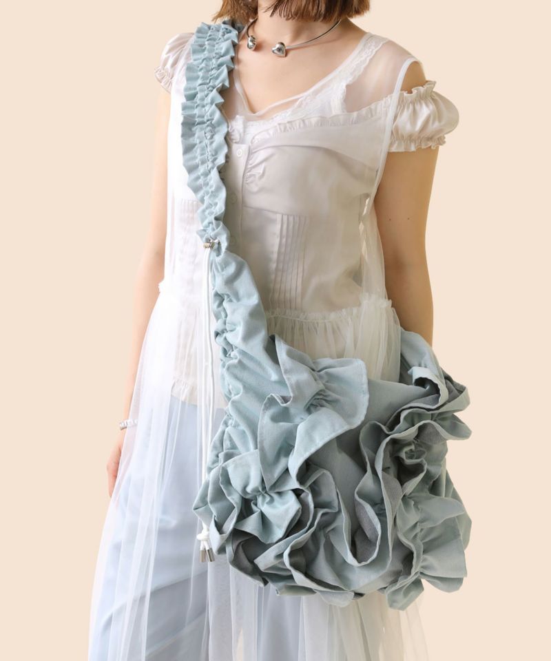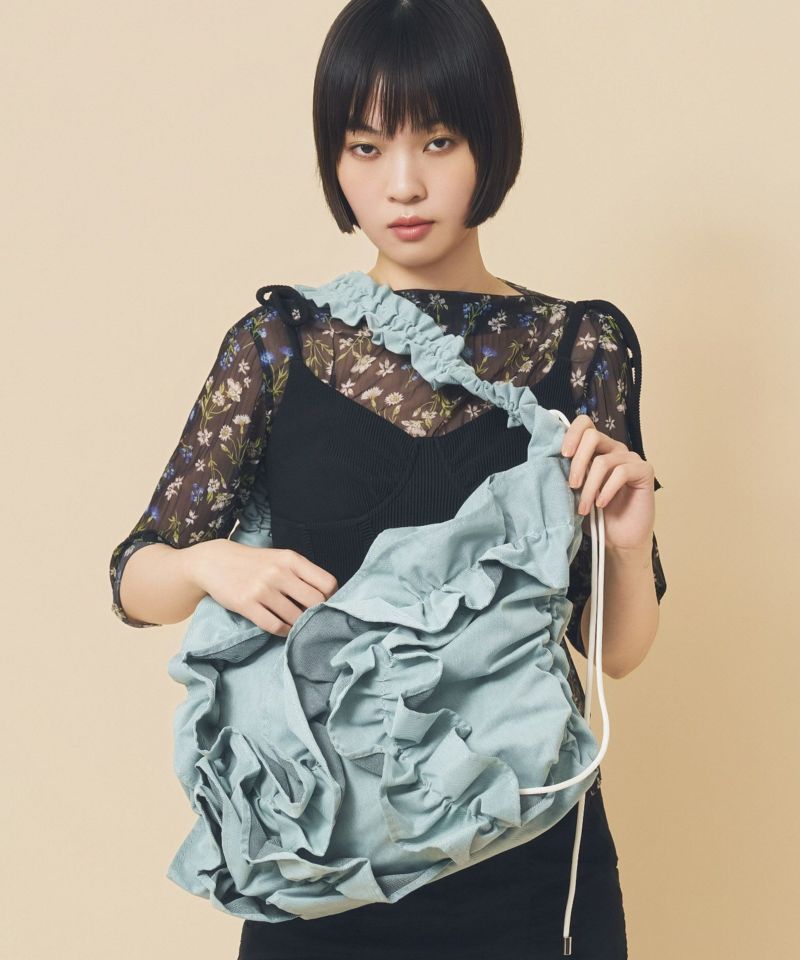 ボリュームたっぷりなフリルを前面にあしらったバッグはコーディネートの主役に。 フリルたっぷりですが、素材はカジュアルなコットン素材を使用しているため、甘すぎずデイリー使いしやすいアイテムに仕上がりました。 大容量で頑丈&内装にはファスナー付きポケットもあり、実用性も抜群です。 ショルダーストラップはサイドのコードで長さを調節可能です。