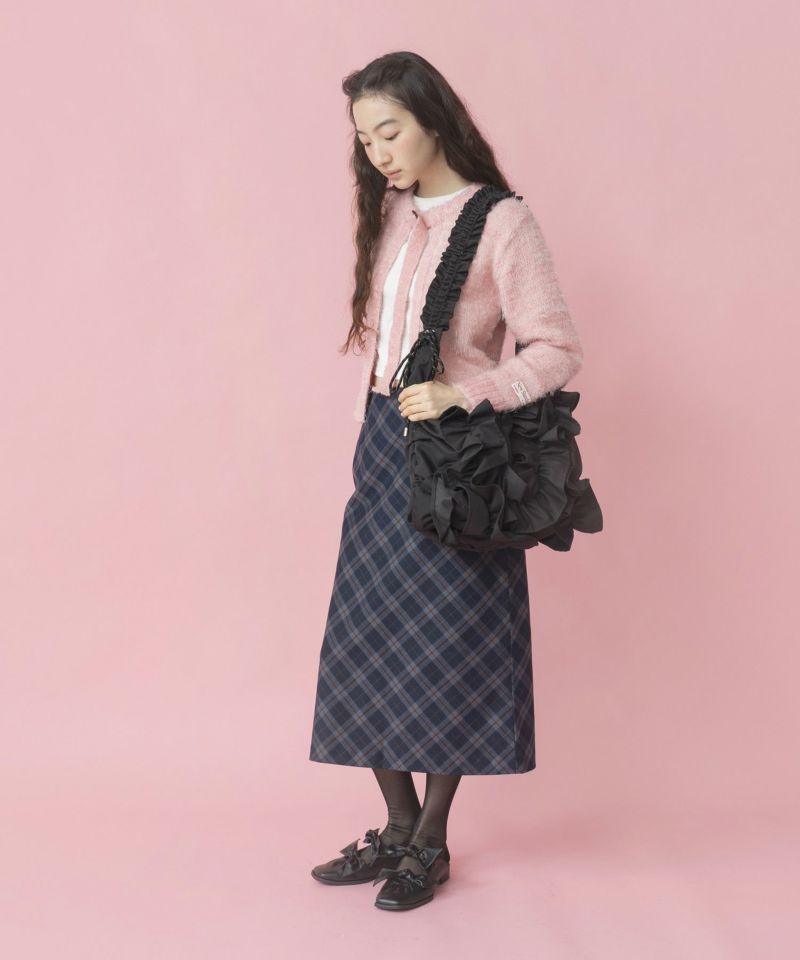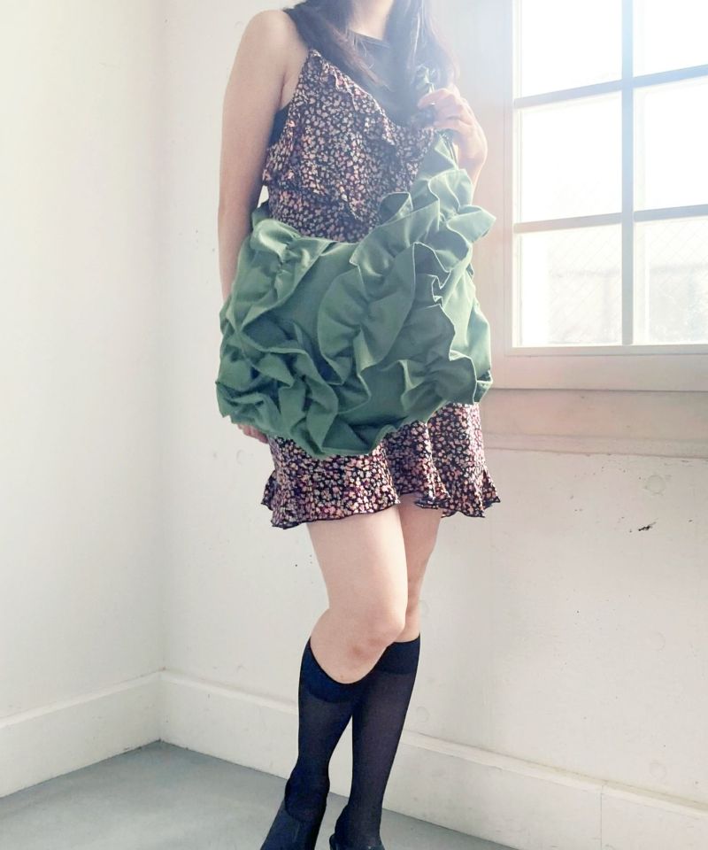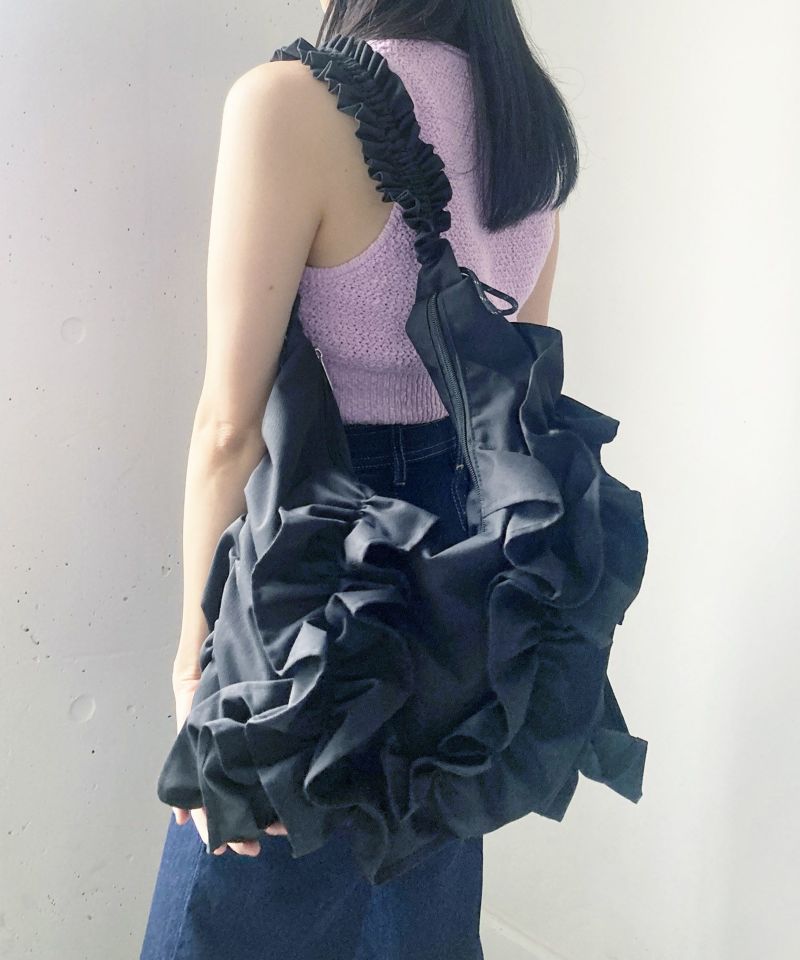 ボリュームたっぷりなフリルを前面にあしらったバッグはコーディネートの主役に。 フリルたっぷりですが、素材はカジュアルなコットン素材を使用しているため、甘すぎずデイリー使いしやすいアイテムに仕上がりました。 大容量で頑丈&内装にはファスナー付きポケットもあり、実用性も抜群です。 ショルダーストラップはサイドのコードで長さを調節可能です。