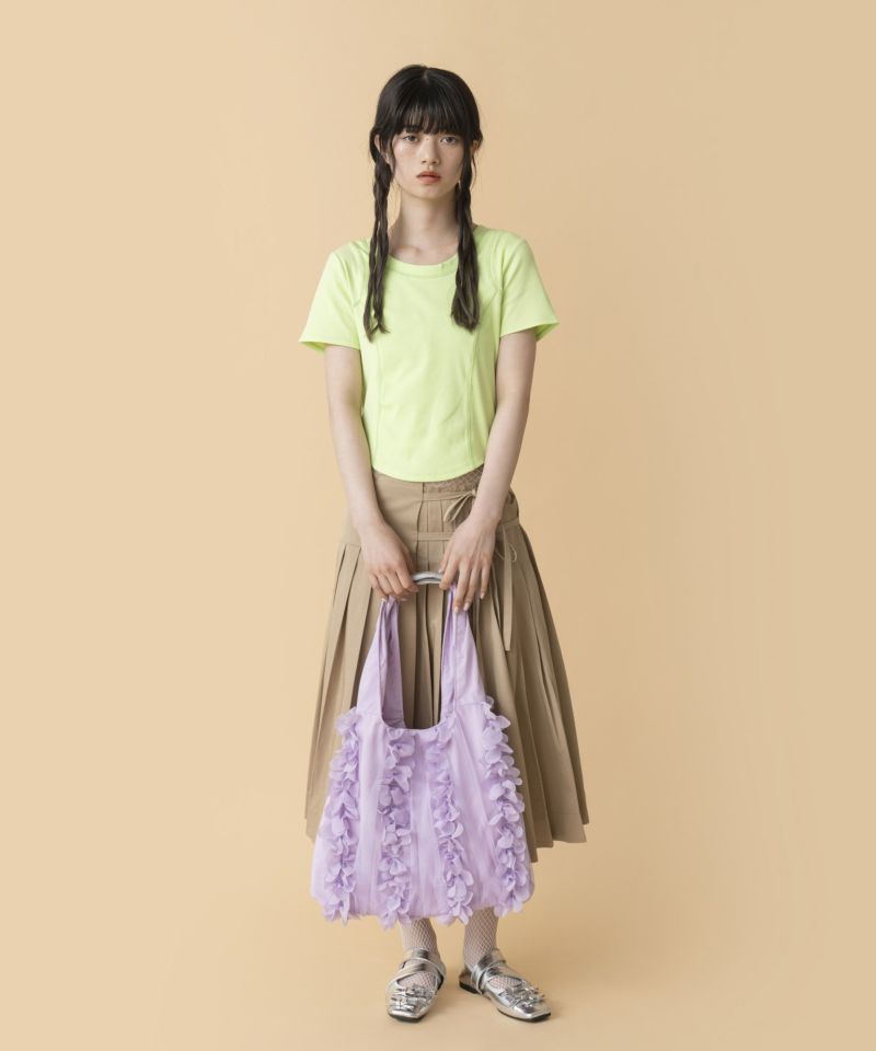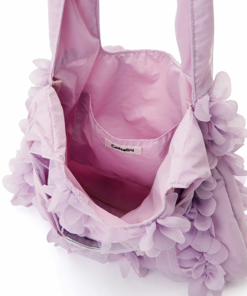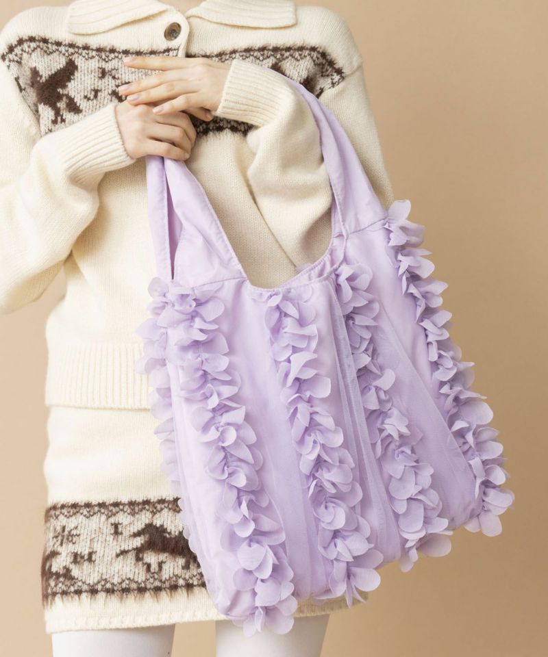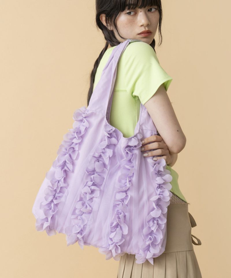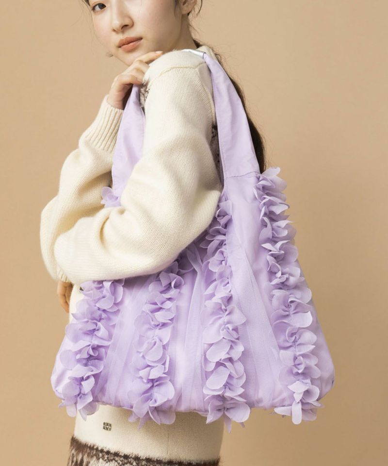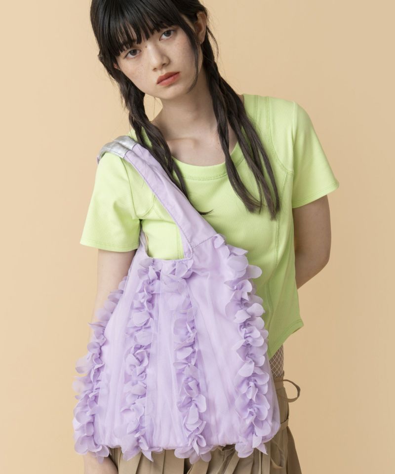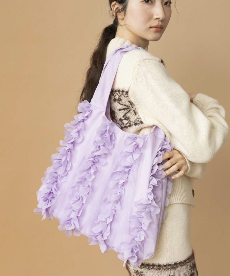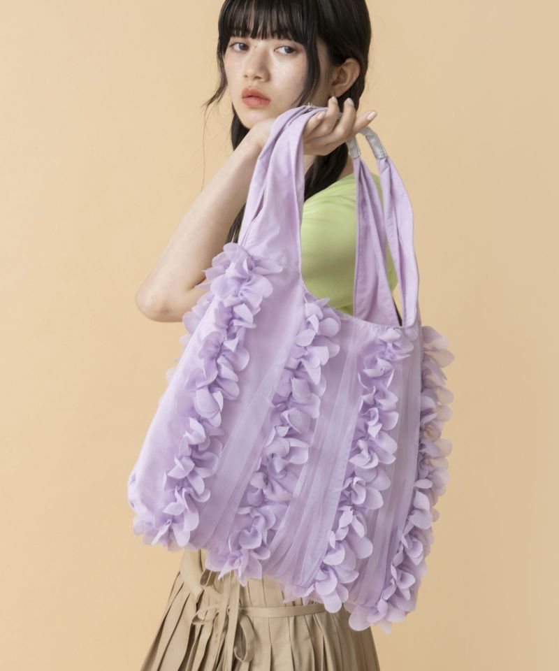 フラワーパーツをフリル状にした、ゴージャスなテープをふんだんに使用したトートバッグ。 甘いフリルにナイロン素材を取り入れることで、甘すぎず程よいカジュアル要素をプラス。 春夏のレジャーシーンが楽しくなるデザインです!
