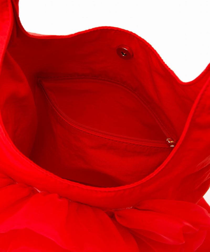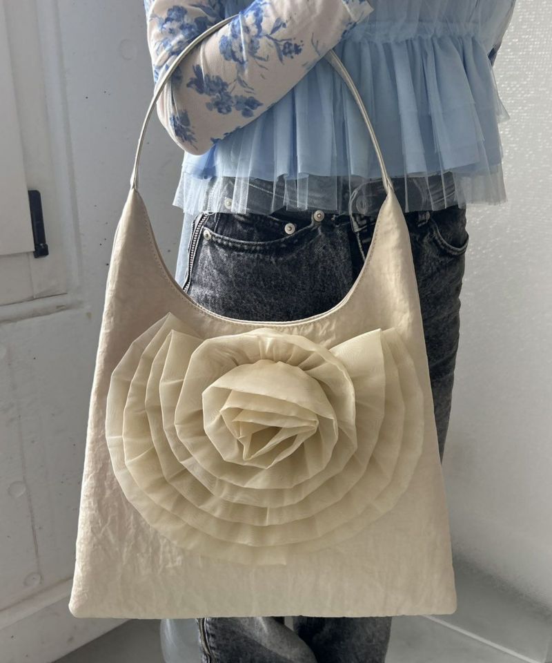 ビックフラワーモチーフが目を惹く肩掛けトートバック。 A4サイズが収納できるサイズで、シルエットもすっきりと見せることが出来る形です。 モードなコーデにも、オケージョンシーンにも使用できる優秀バックです。