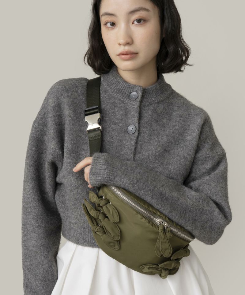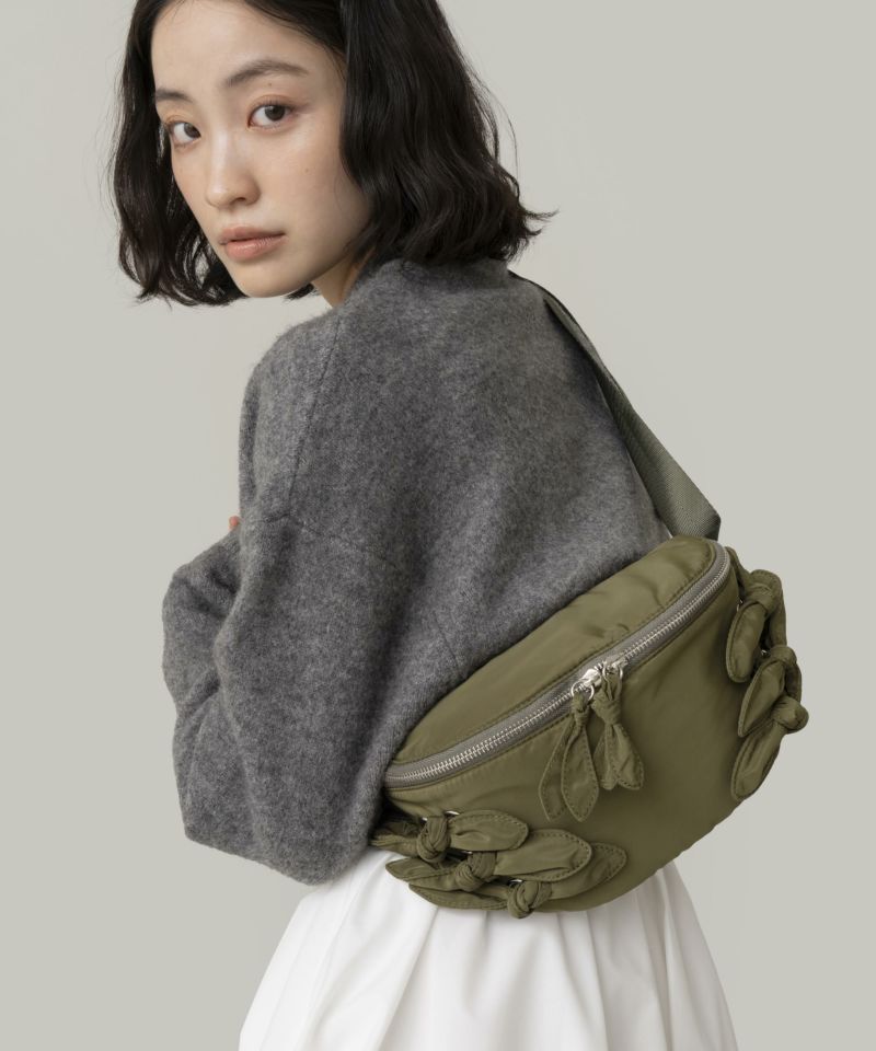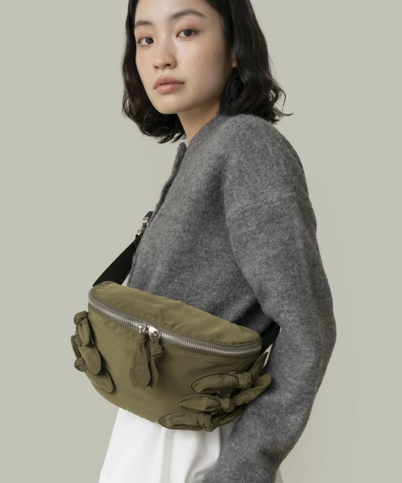 光沢感のある軽量素材を使用したリボン付きウエストポーチ。 ショルダーの長さ調整が可能で、斜め掛けやワンショルダーとしても使える2WAY仕様。 三つ折り財布や小さめポーチ、ハンカチが入る実用的なサイズ感で、旅行やアウトドアにも最適です。 デニムやスニーカーなどのカジュアルコーデはもちろん、ワンピースに合わせた“外し”アイテムとしてもおすすめです。