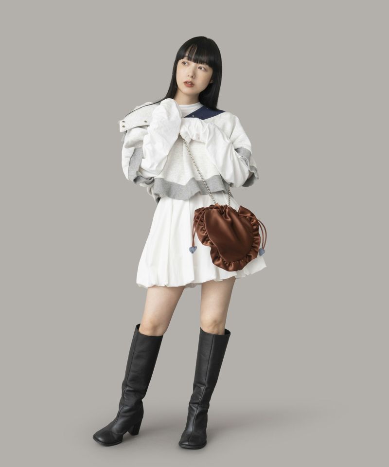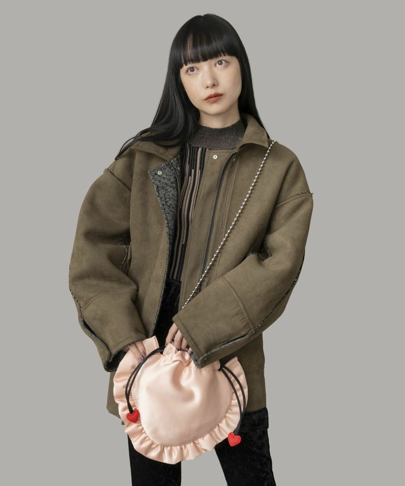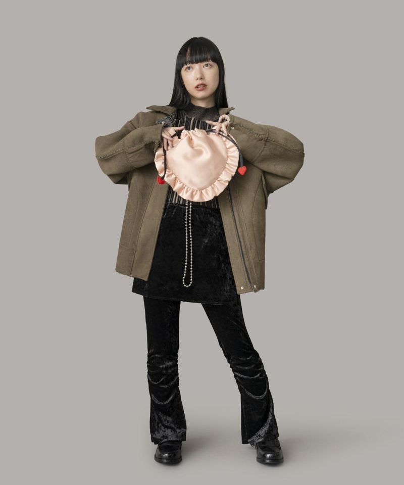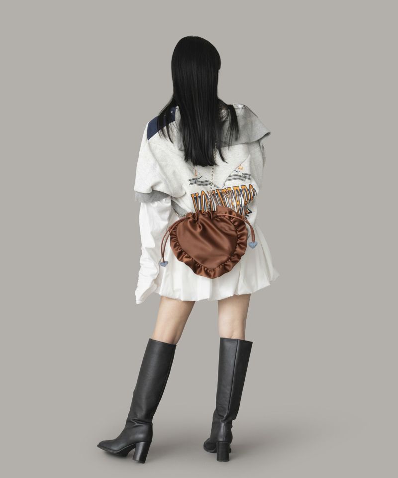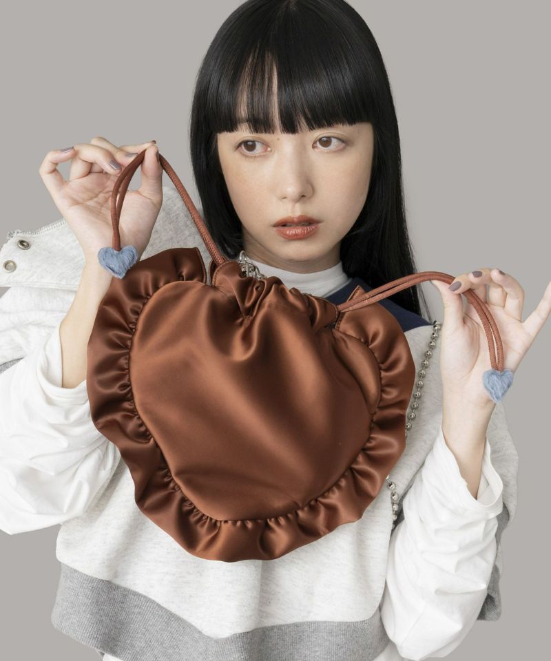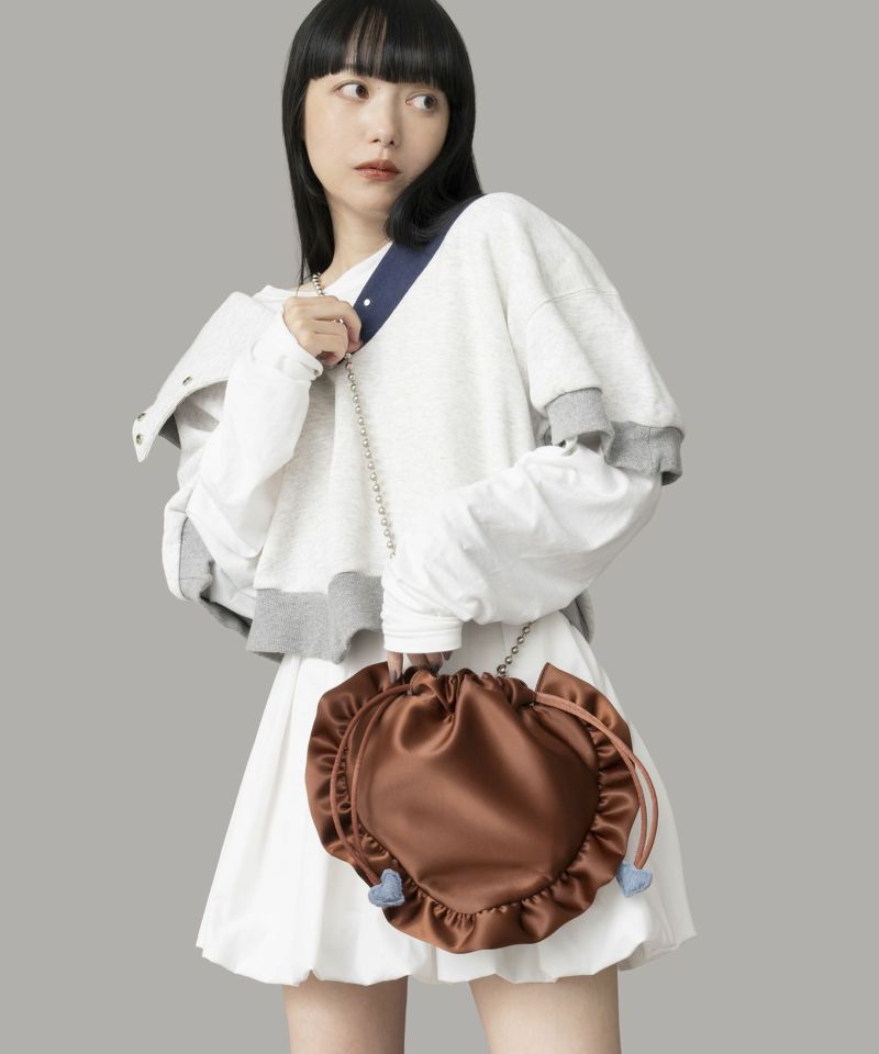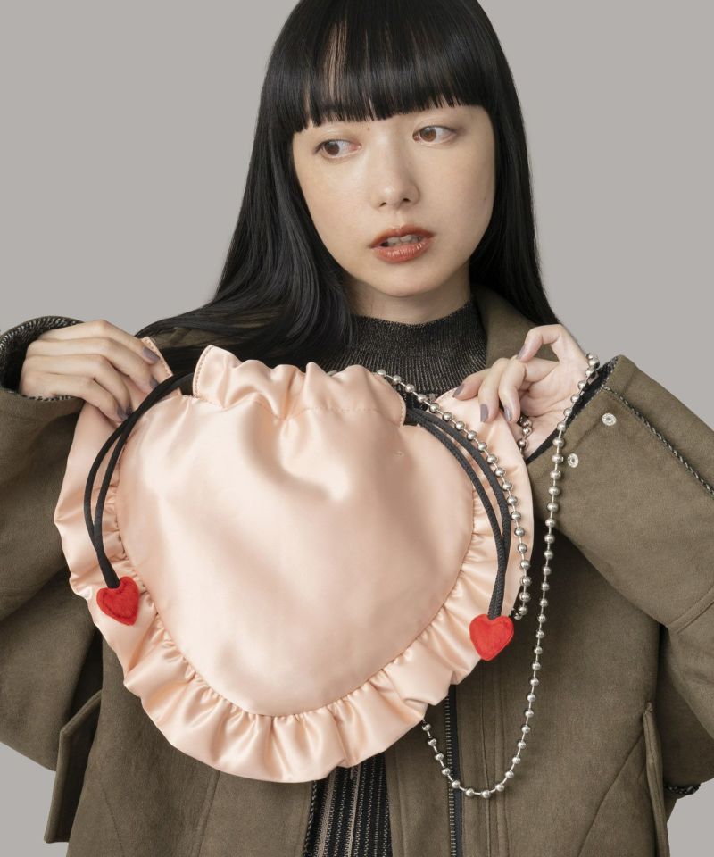 口元をしぼるとハート型のシルエットになる、コロンとしたフォルムが目を惹く巾着BAG。 コード先のモフモフ素材のハートモチーフがキュンポイント。 口元には中央にメタルハートチャーム付き。 取り外しできるボールチェーンショルダー付で2WAYでお楽しみいただけます。 オケージョンシーンはもちろん、シンプルなコーディネイトのポイント使いとしても◎