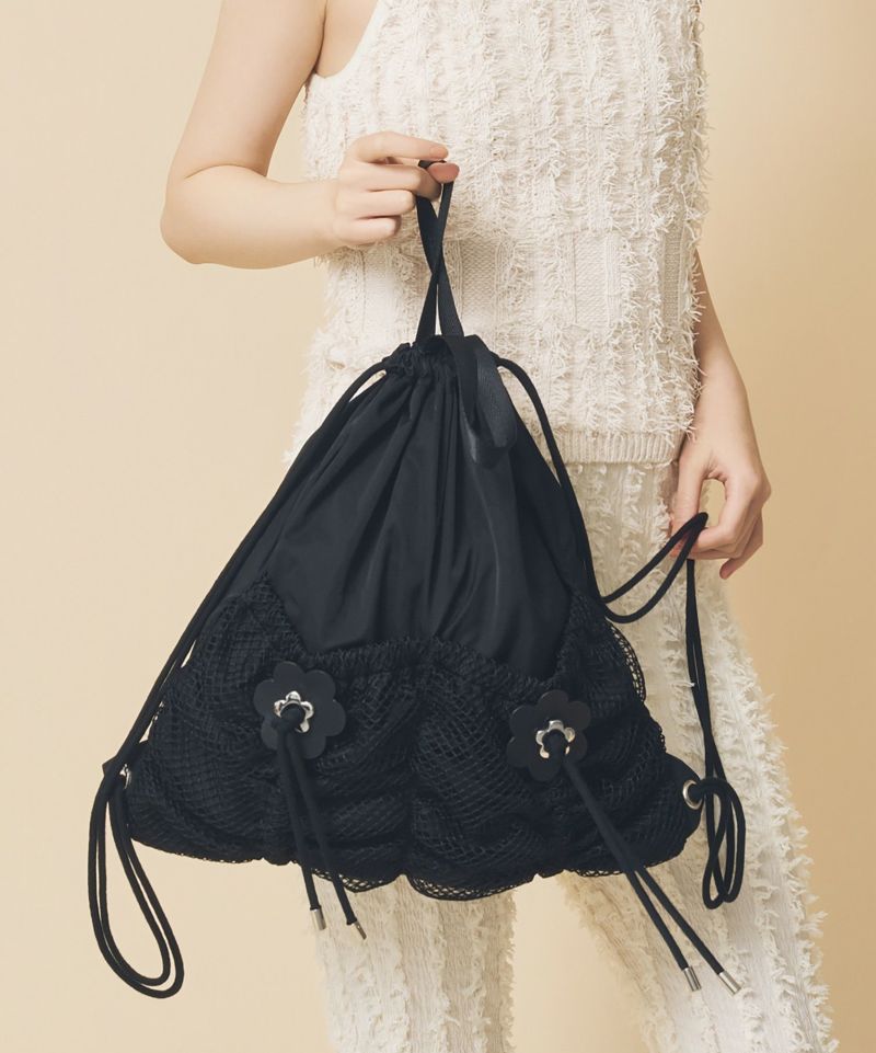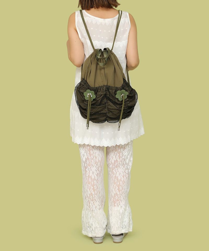 両サイドのフラワーモチーフがアクセントになったナップサック。