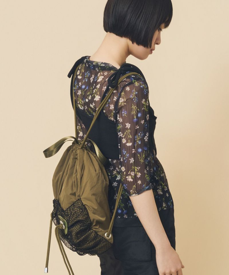 本体はナイロン素材、ポケットにはメッシュを使用したドローストリング仕様で抜け感のあるデザインに仕上げました。