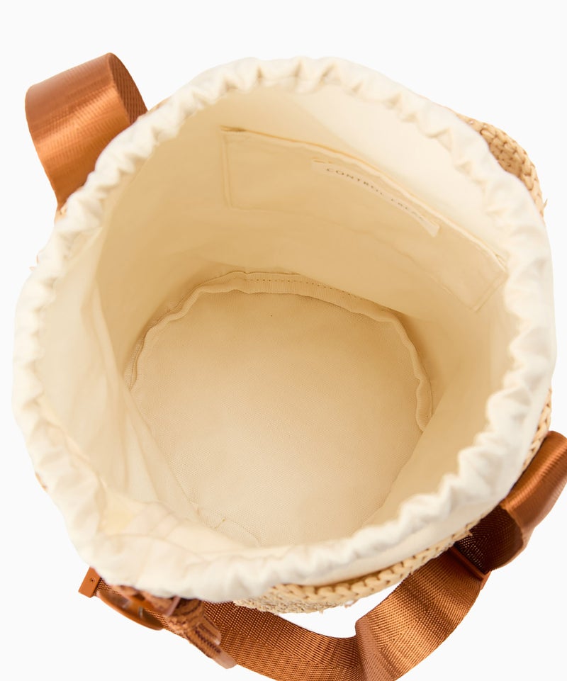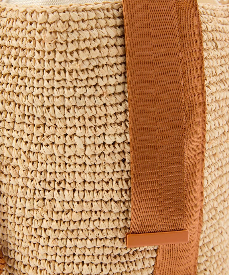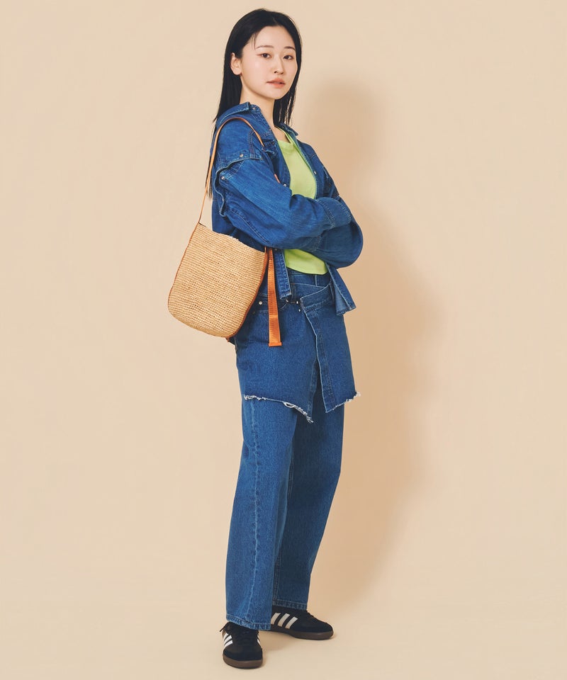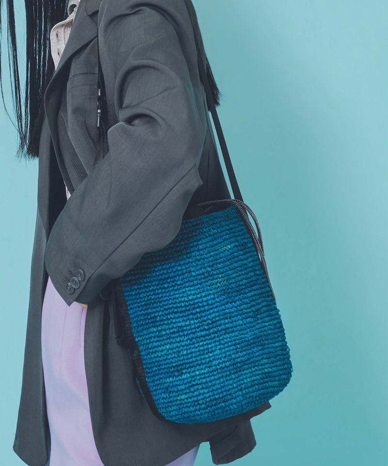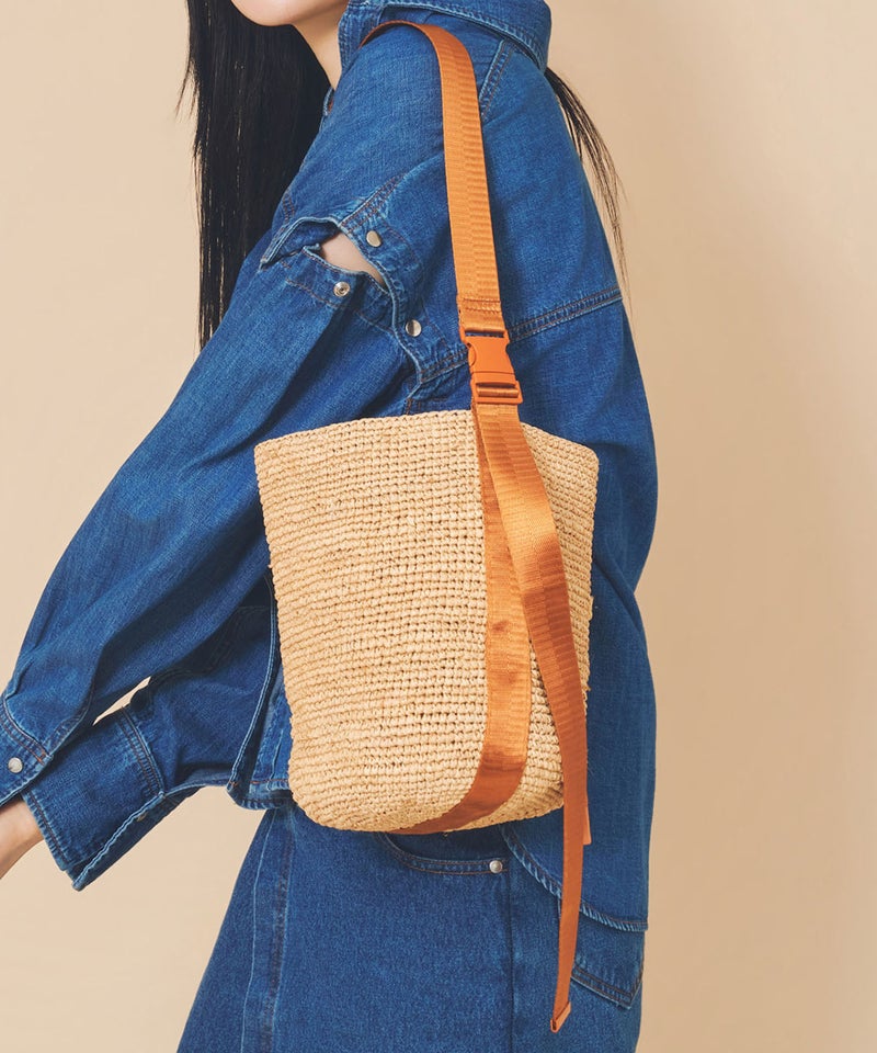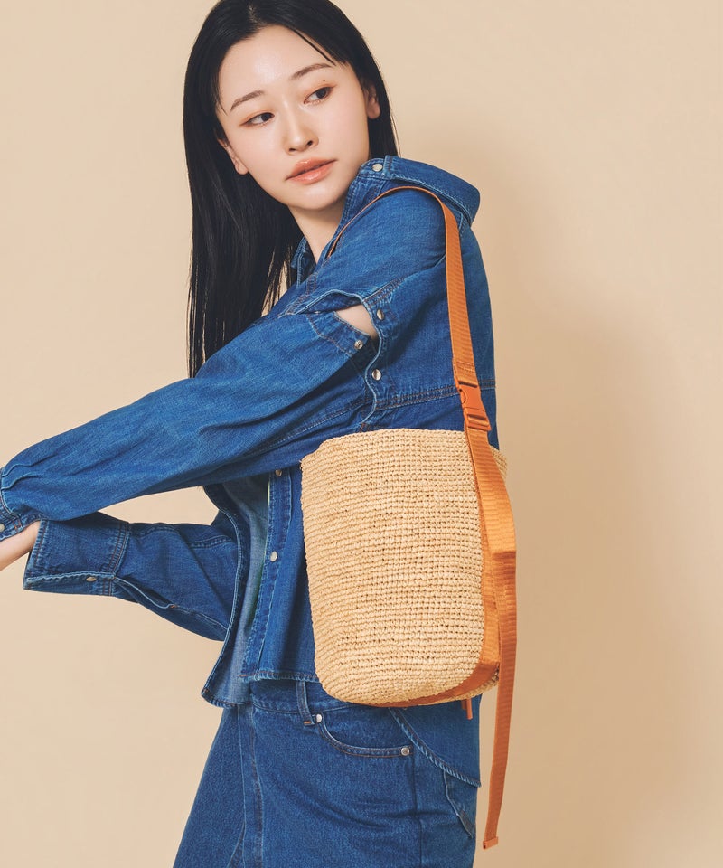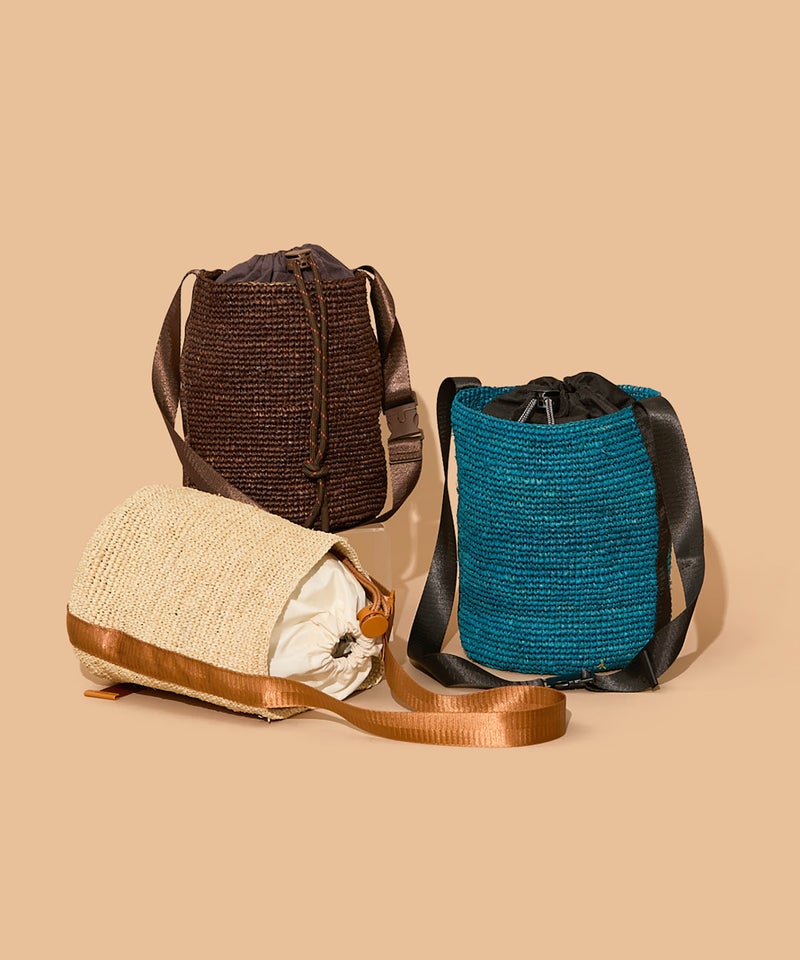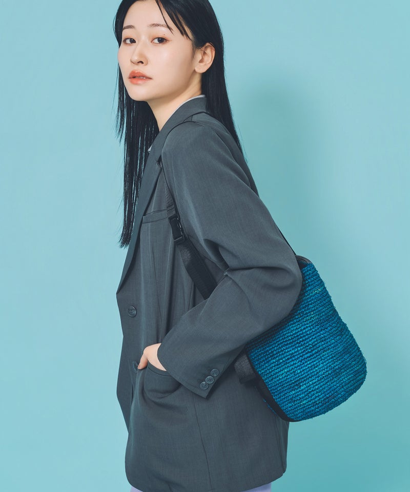 涼しげなラフィア素材にテープやドコード使いでスポーティーテイストをプラス。 カジュアルで使い勝手のバケツ型の巾着バッグに仕上げました。 内側の巾着は取り外しも可能で、お手入れのしやすさも嬉しい◎