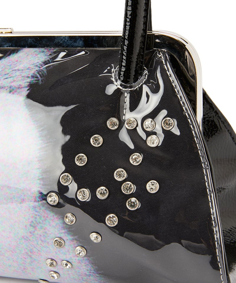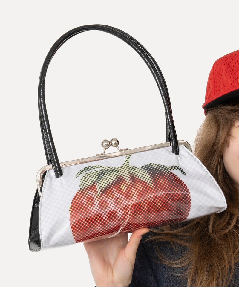 威嚇している猫ちゃんVSイチゴ、PINKかわいいteddyベアVS「UGGH!(げけっ!)」ロゴ、オモテと裏で違うプリントを仕込んだ二重人格BAG。
