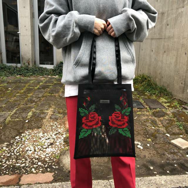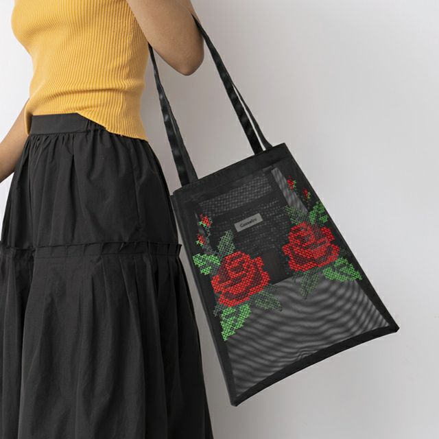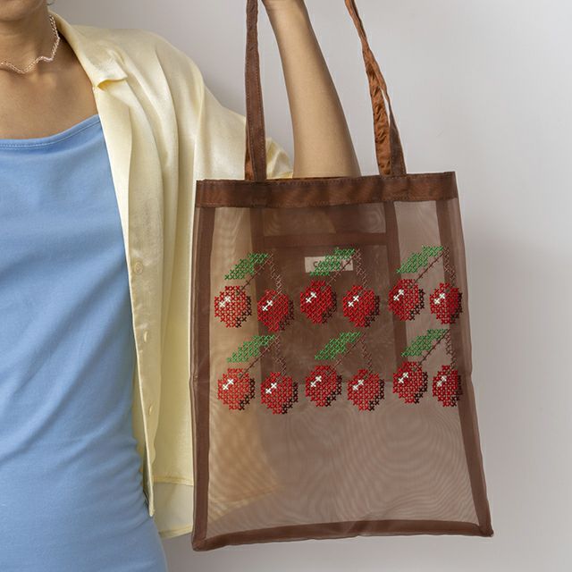 春夏らしい清涼感のあるチュール素材のトートバッグにクロスステッチ刺繍を施したアイテム。チュール素材なので重さがなく、ストレスフリーにお持ちいただけます。