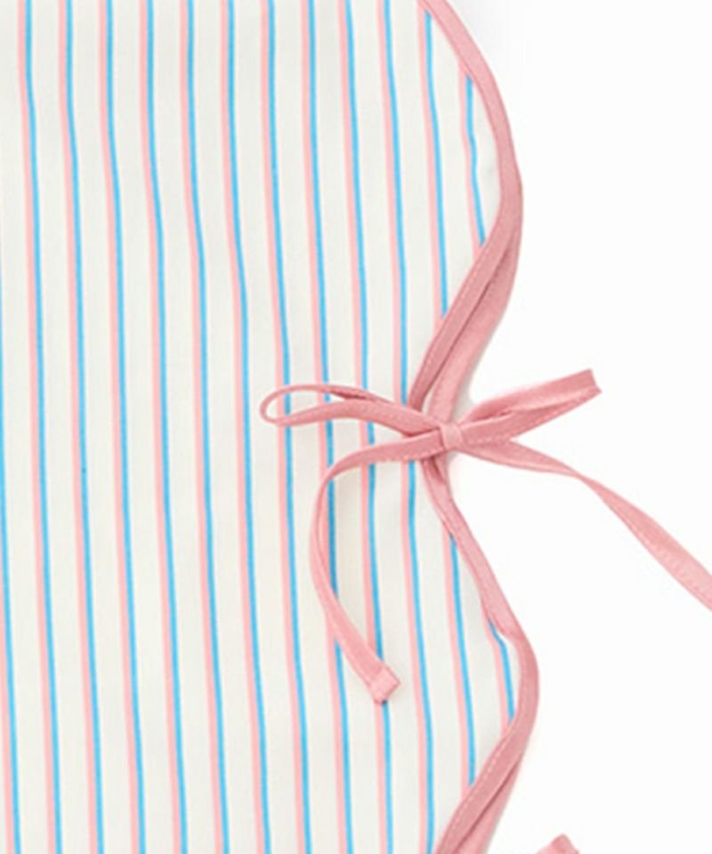 クリーンな印象のストライプに、なみなみデザインの裾とサテンリボンの組み合わせがポイント。