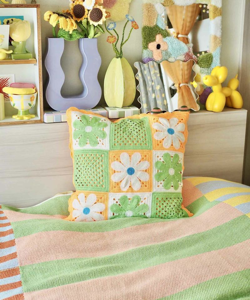 トレンドのクロシェ編みのクッションカバー。 ハート柄は、ドット絵のように、お花は、チェックと織り交ぜたデザインがポイント。 カラフルな色づかいがお部屋に春夏らしさをプラスしてくれます! お揃いのマルチカバーもあるので、柄違いでお部屋に置くのもおすすめ。 裏は無地布。ファスナー仕様です。 ▶クロシェマルチカバー