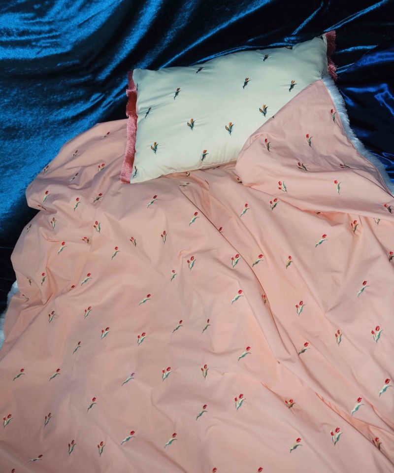 チューリップ柄になってバージョンアップ! 刺繍やフリンジ、アクセントになるカラーリングなど、かわいいを詰め込んだ布団カバー。 メインのカラーは淡い色なので、お部屋全体が優しい雰囲気に。 コットン素材で肌触りも◎ 背面の生地は刺繍なしのため、寝ているときも心地よいデザインです。 小花柄でピッチも広めのため、お部屋にもなじみます。 (サイズはシングルタイプ) 枕カバーはこちら ▶フリンジ枕カバー