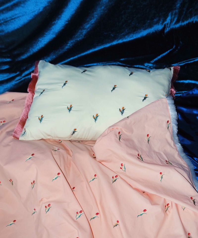 刺繍やフリンジ、アクセントになるカラーリングなど、かわいいを詰め込んだ枕カバー。