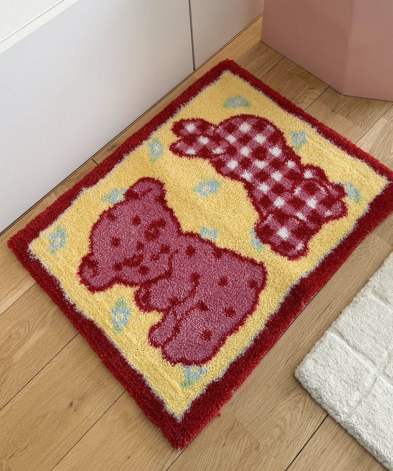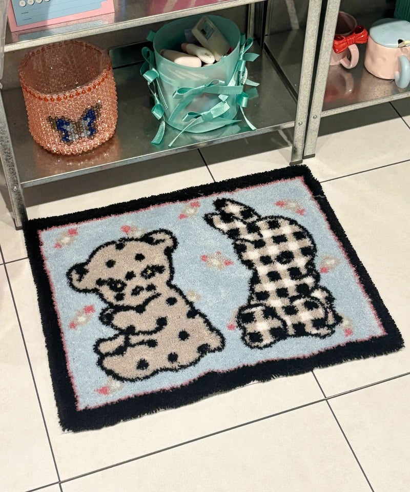 くまとうさぎのデザインがなんとも愛らしいラグ。