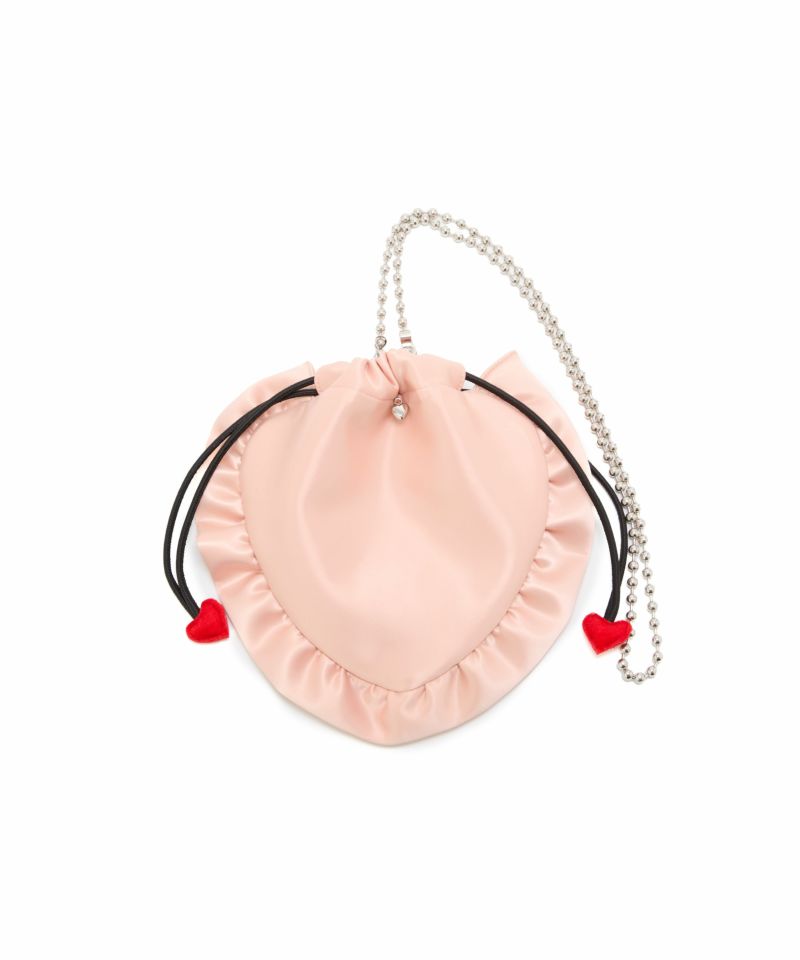 口元をしぼるとハート型のシルエットになる、コロンとしたフォルムが目を惹く巾着BAG。 コード先のモフモフ素材のハートモチーフがキュンポイント。 口元には中央にメタルハートチャーム付き。 取り外しできるボールチェーンショルダー付で2WAYでお楽しみいただけます。 オケージョンシーンはもちろん、シンプルなコーディネイトのポイント使いとしても◎