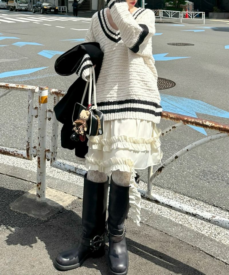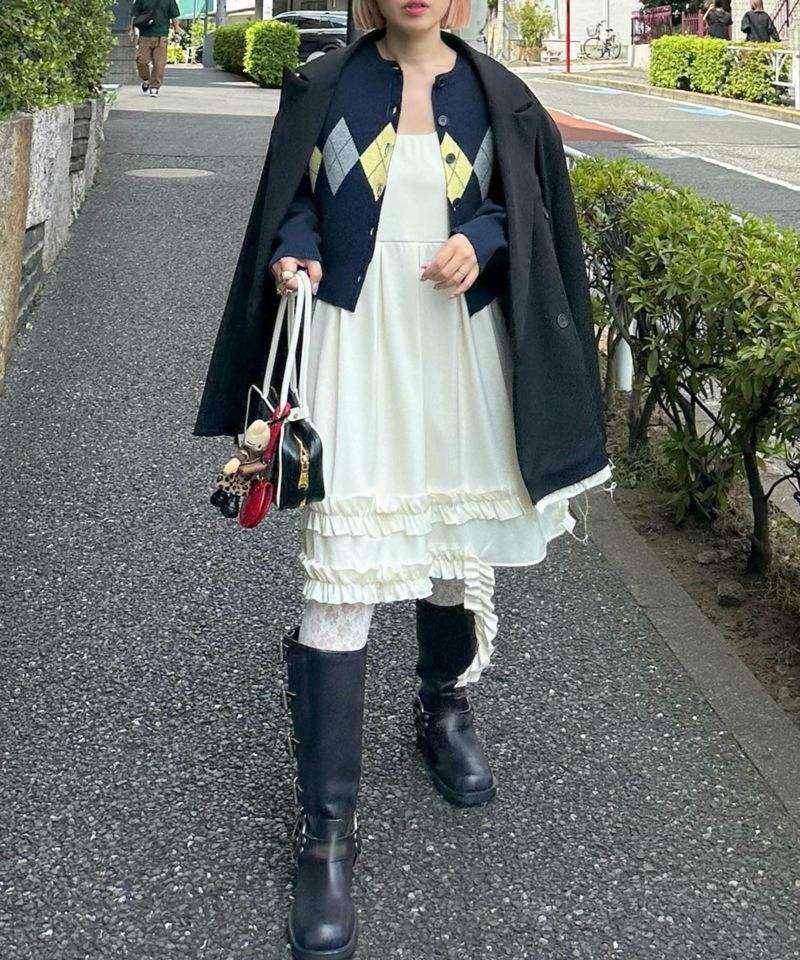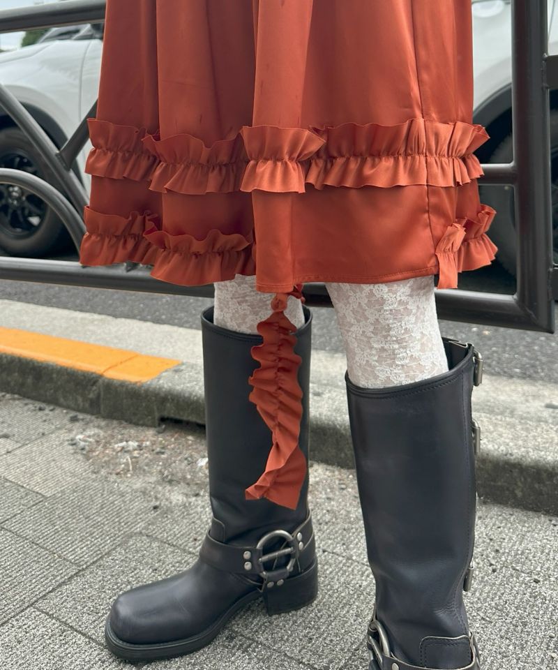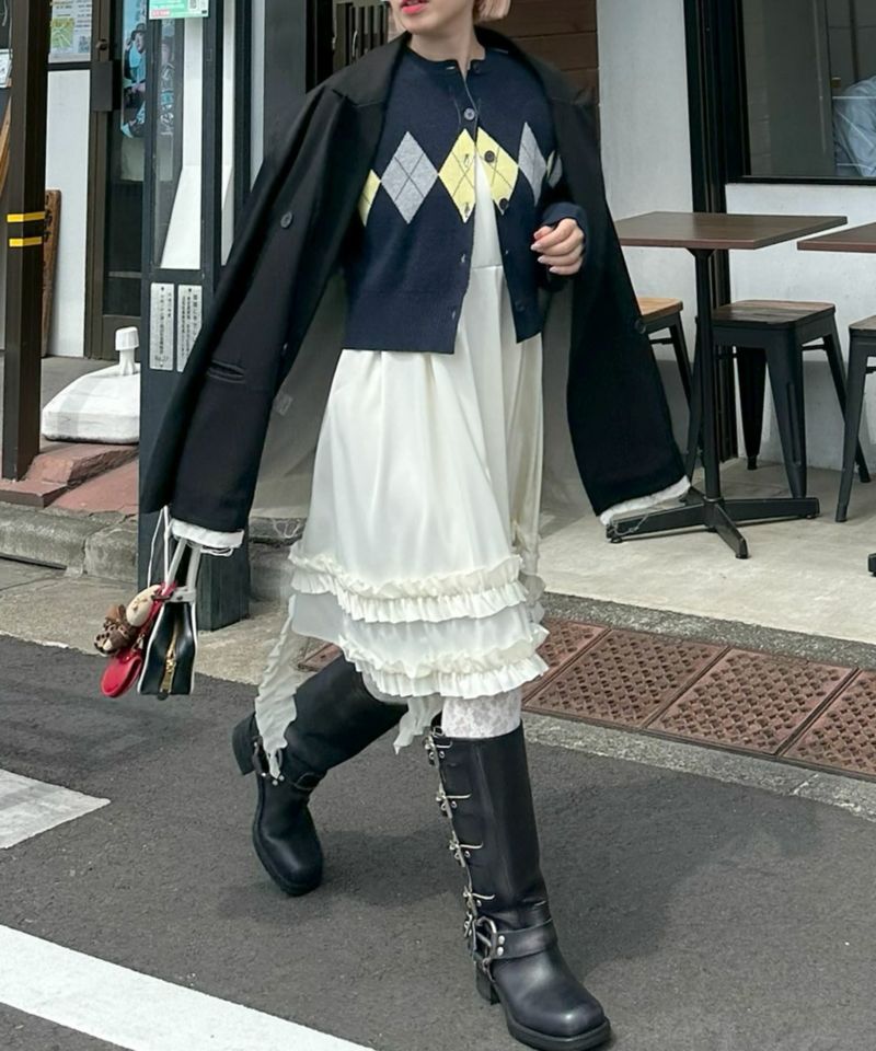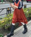 ・足元はブーツやレッグウォーマーにスニーカーを合わせるとバランス良くまとまります◎
