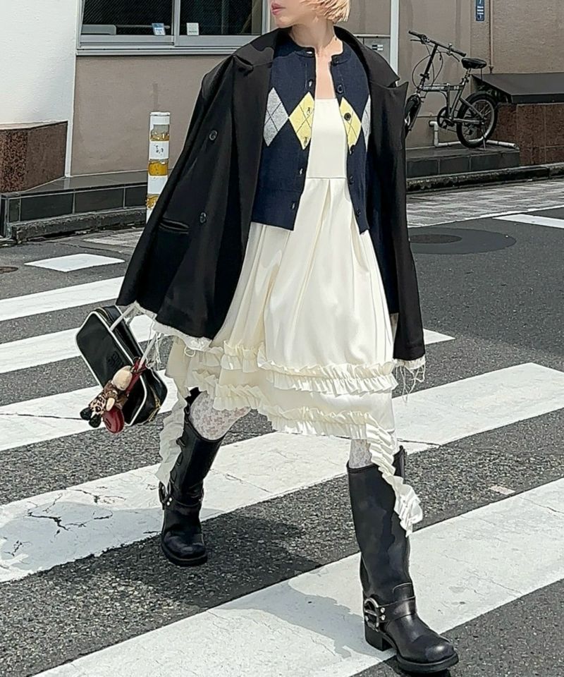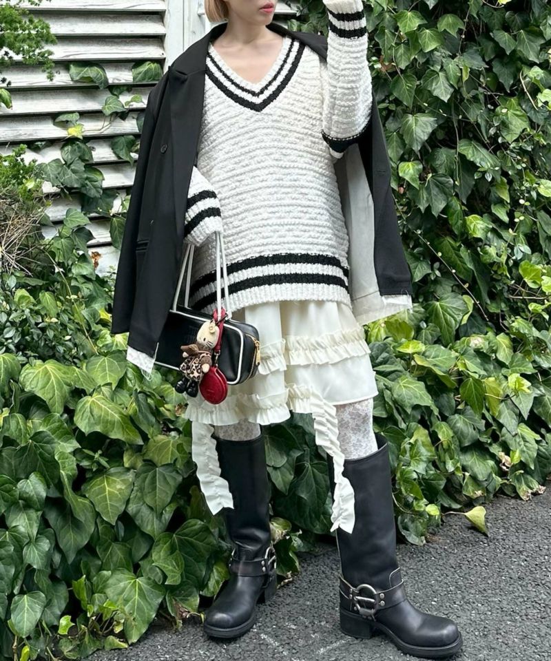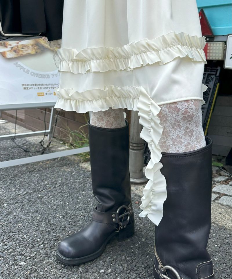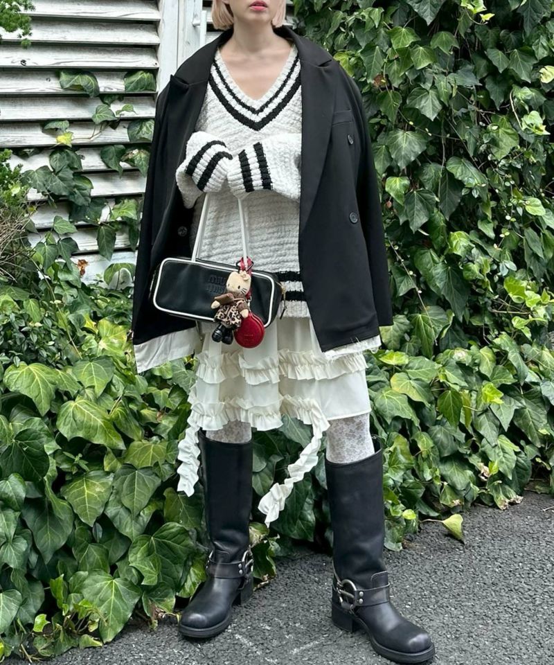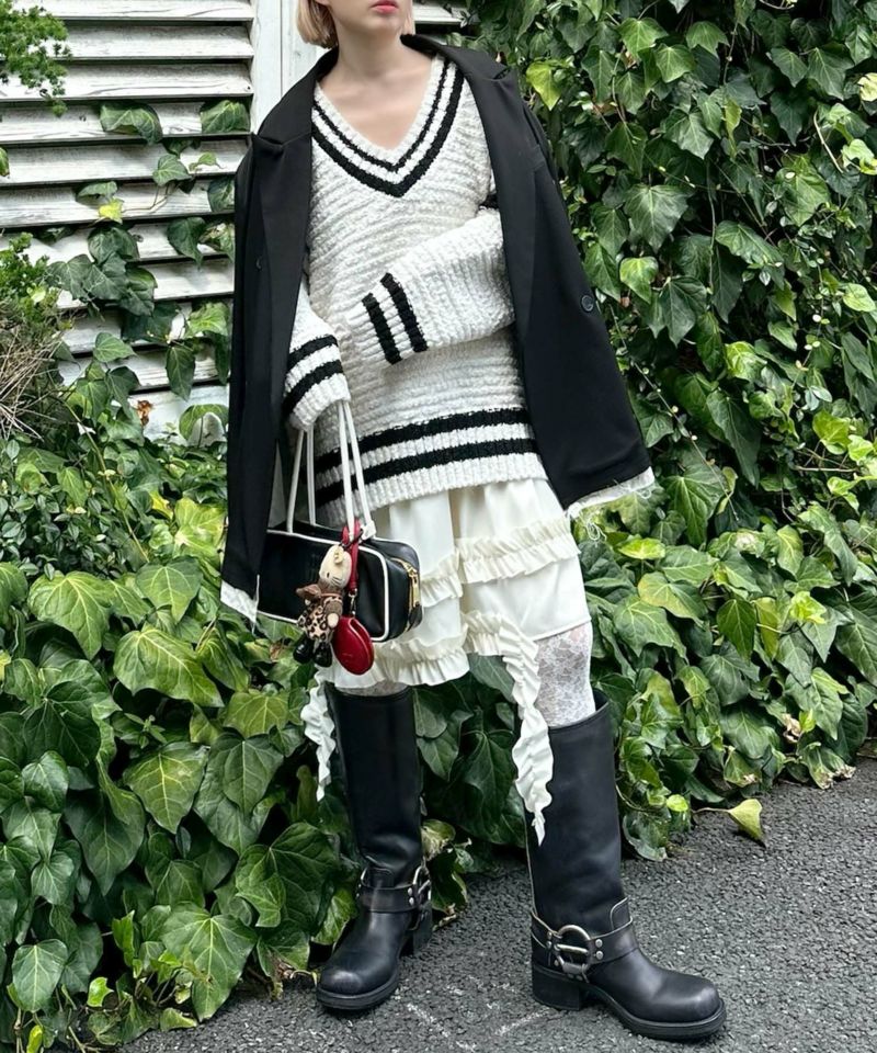 ・足元はブーツやレッグウォーマーにスニーカーを合わせるとバランス良くまとまります◎