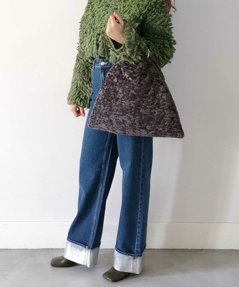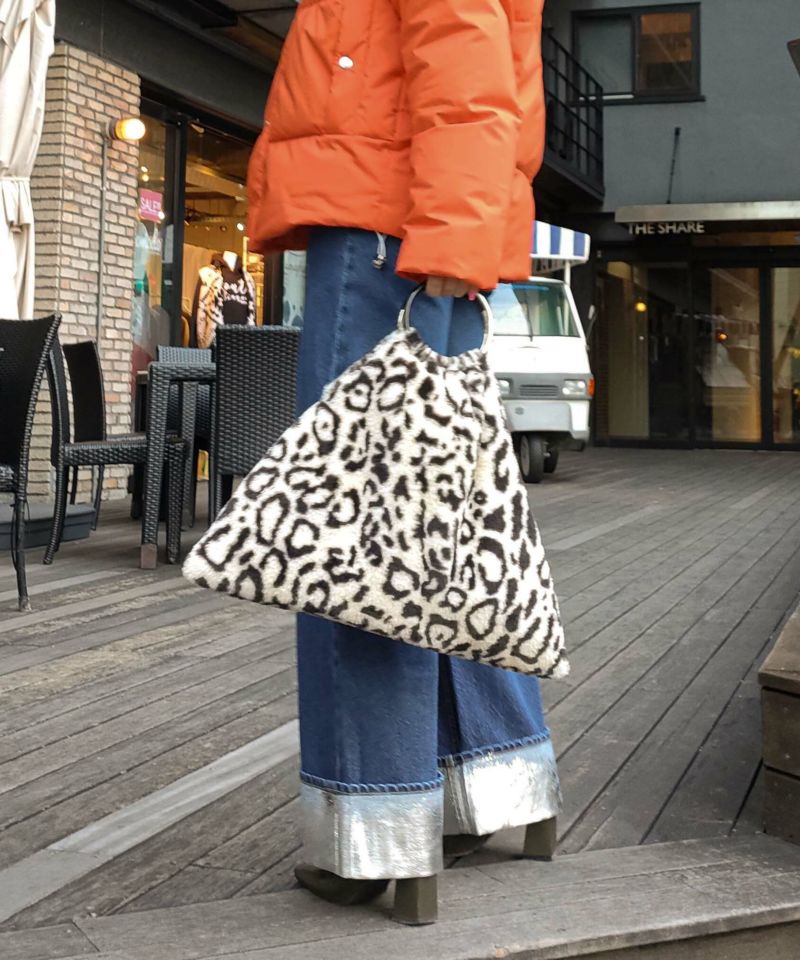 フワフワのカラーファーのボディにメタルのリングハンドルがポイント。