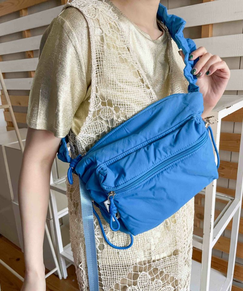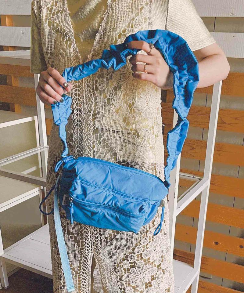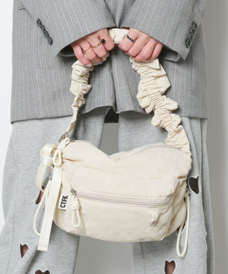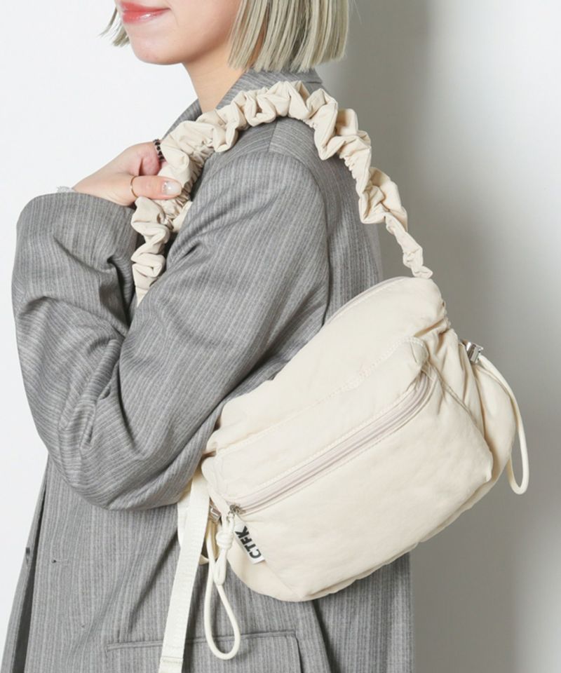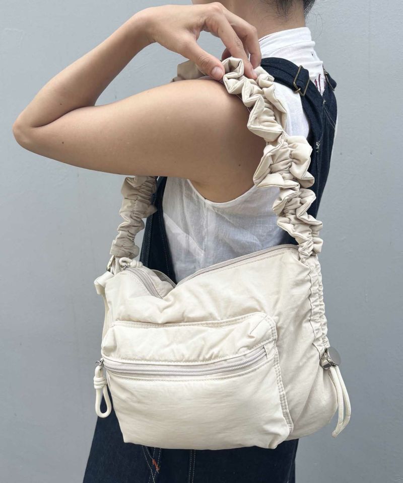 トレンドのギャザーをショルダーとボディに備え、コーディネートのアクセントを担いながらマルチなサイズに変更できる機能的なデザインが魅力です。