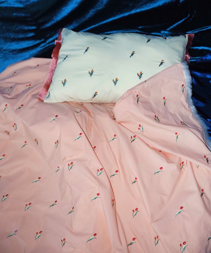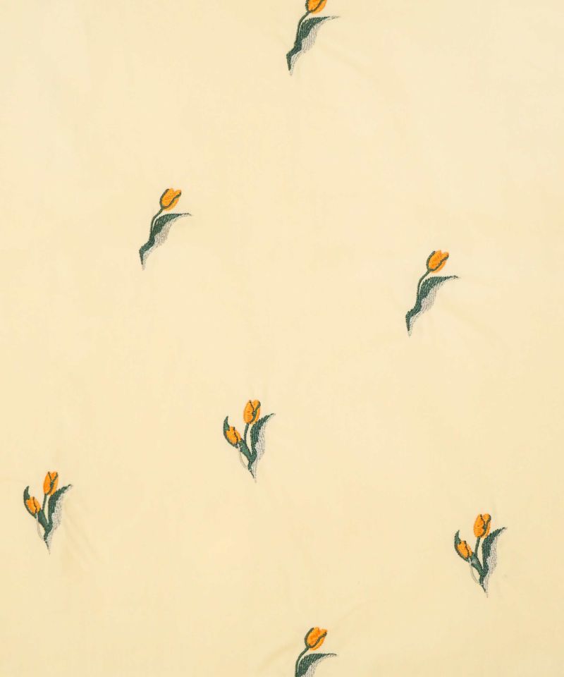 チューリップ柄になってバージョンアップ! 刺繍やフリンジ、アクセントになるカラーリングなど、かわいいを詰め込んだ布団カバー。 メインのカラーは淡い色なので、お部屋全体が優しい雰囲気に。 コットン素材で肌触りも◎ 背面の生地は刺繍なしのため、寝ているときも心地よいデザインです。 小花柄でピッチも広めのため、お部屋にもなじみます。 (サイズはシングルタイプ) 枕カバーはこちら ▶フリンジ枕カバー