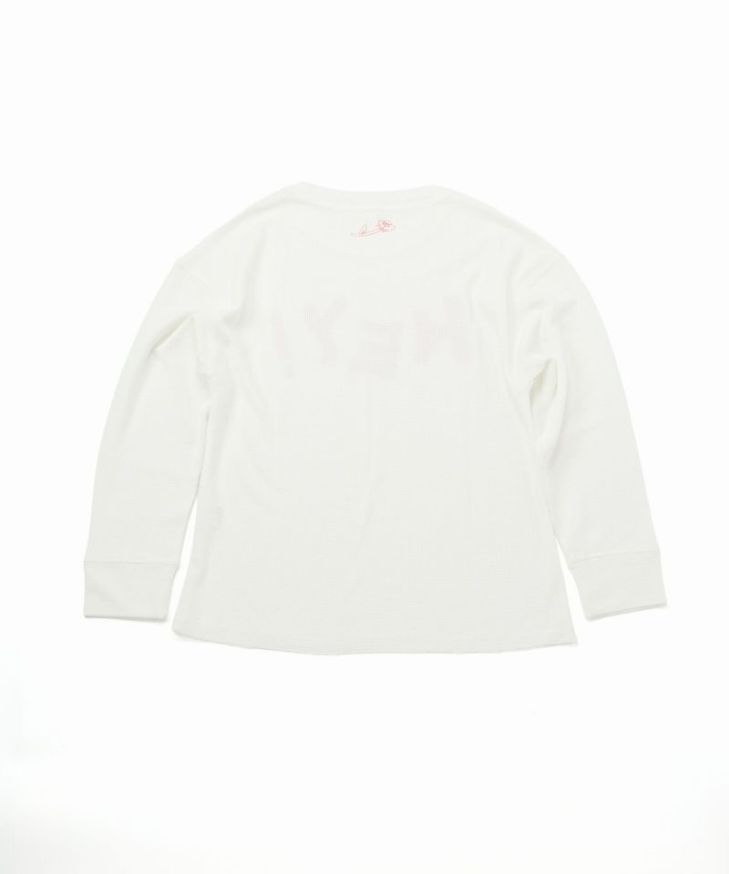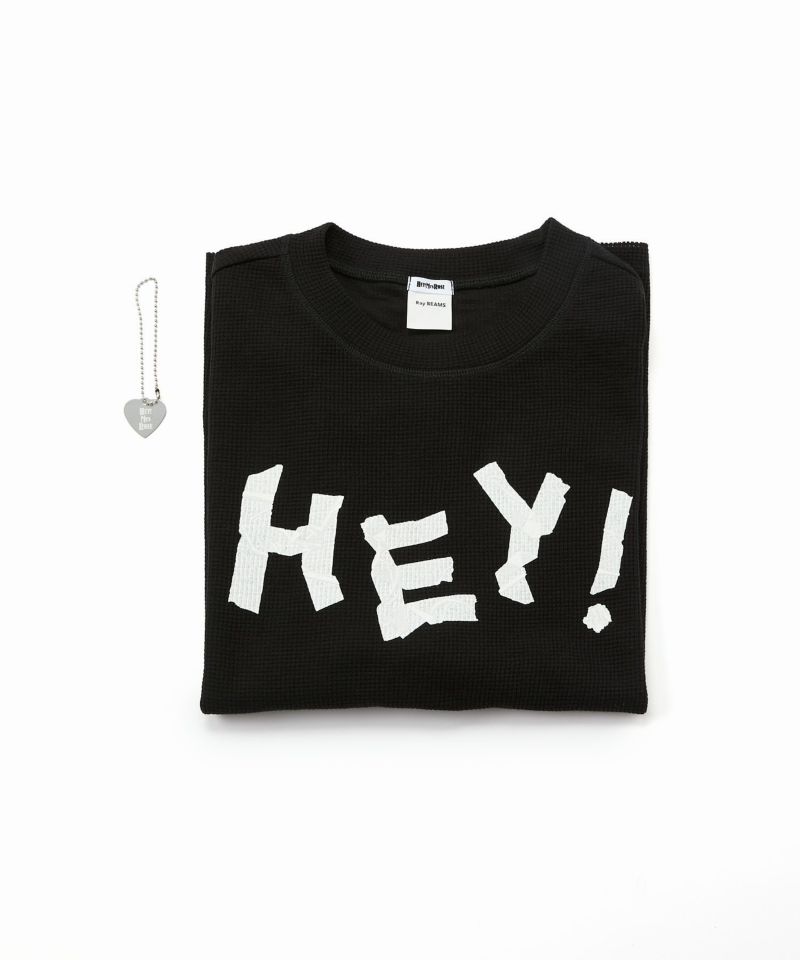 「HEY!」の文字をマスキングテープで貼ったみたいにプリントした、テンション高めなサーマルロンT。