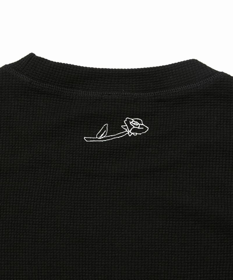背面の首元には、ブランドアイコンのローズプリントをオン。バックスタイルまで抜かりなしで、どこから見ても“気分アガる”デザイン。