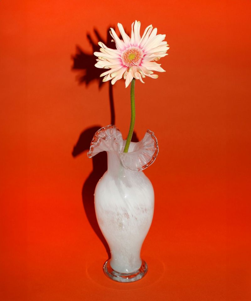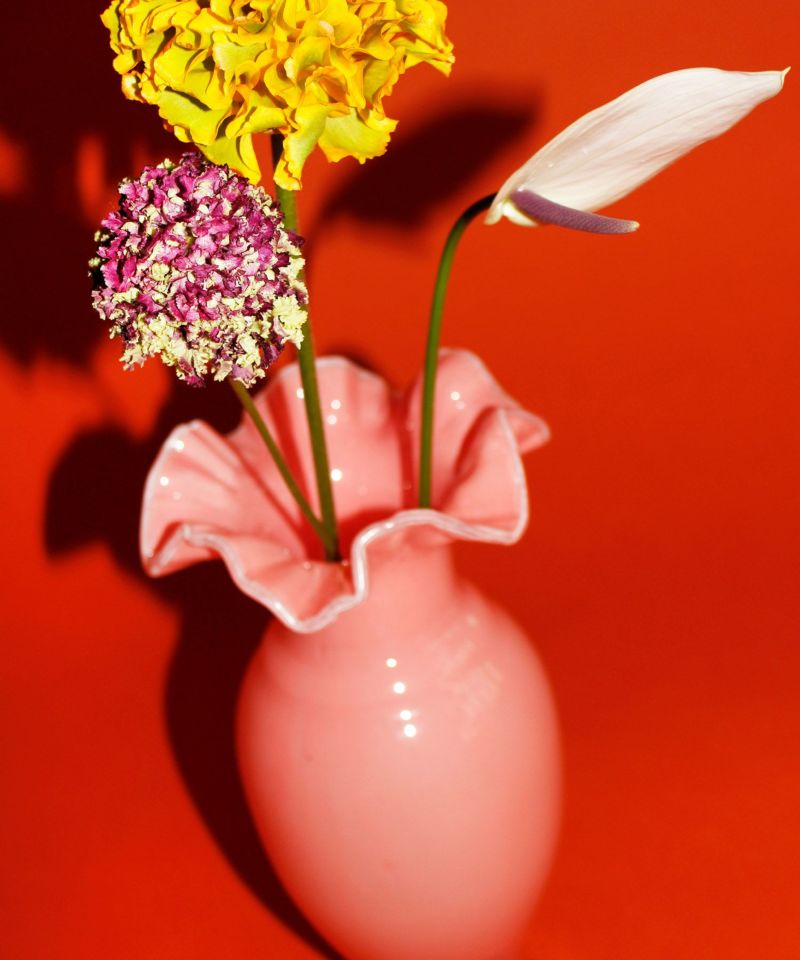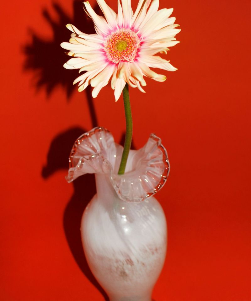 柔らかいカラーとヴィンテージ調のシルエットがポイントのガラスフラワーベース。