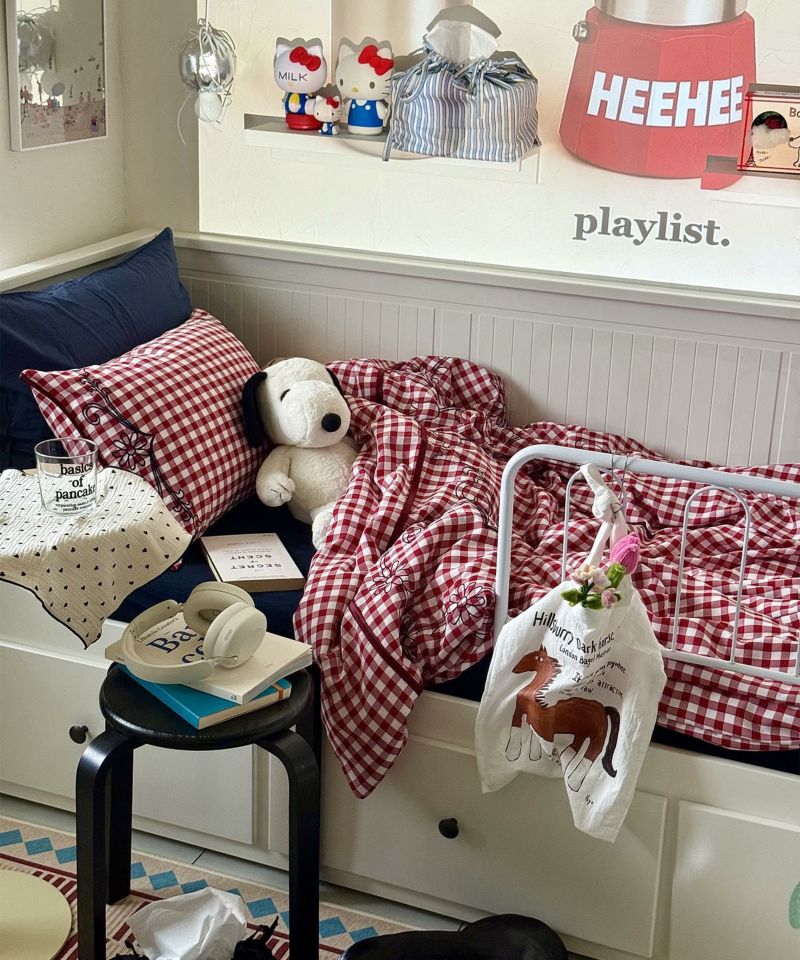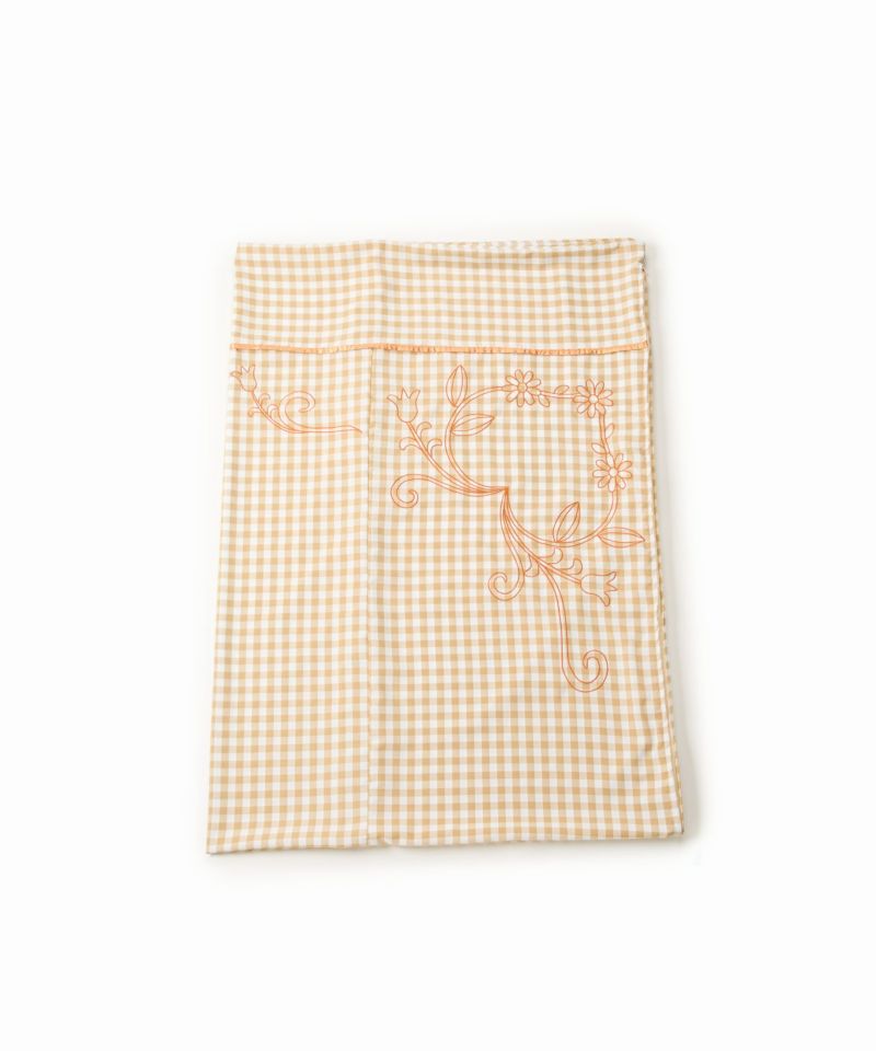 落ち着いた雰囲気のギンガムチェックに、オリジナル刺繍と艶のあるサテンパイピングでポップなCasseliniらしさをプラス。