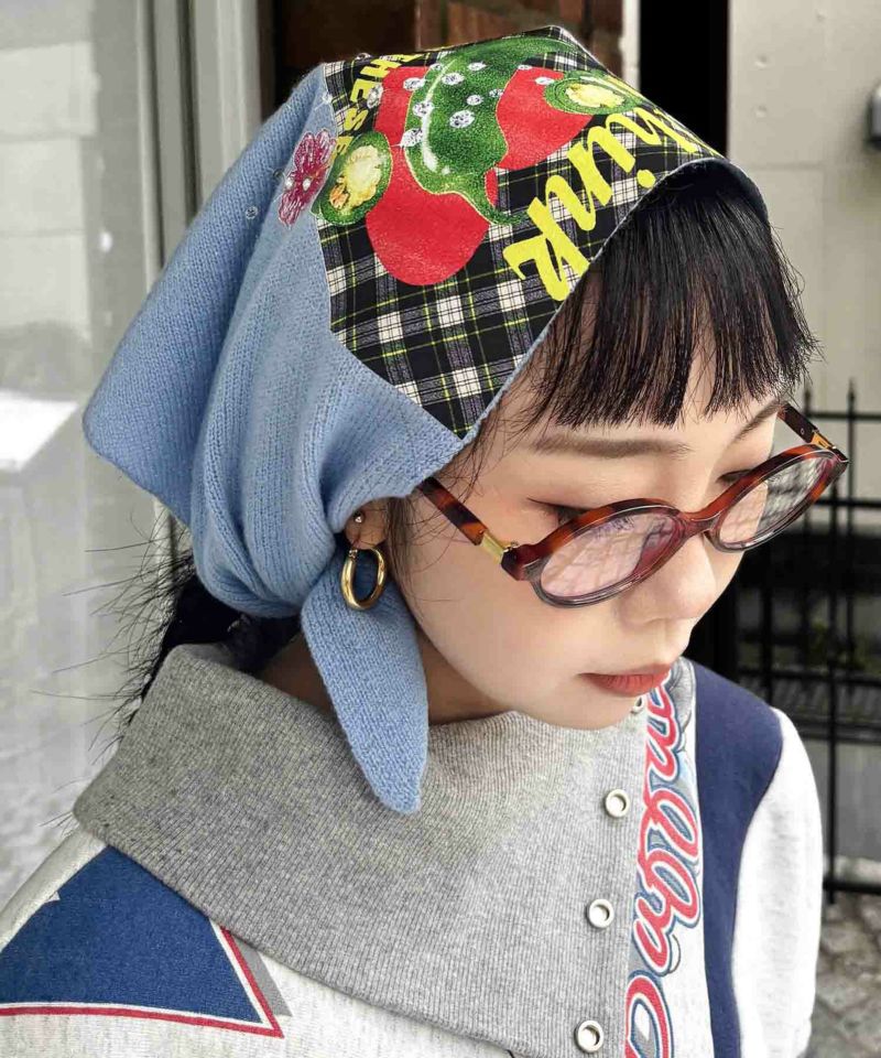 アイボリーとブルーの図案は、「とうがらしのグラフィックが気に入って購入したチェックのバンダナと手芸屋さんの閉店セールで見つけたスパンコールパーツと缶バッジとどこかからくっついてきたビニールテープを丸めたもの」。