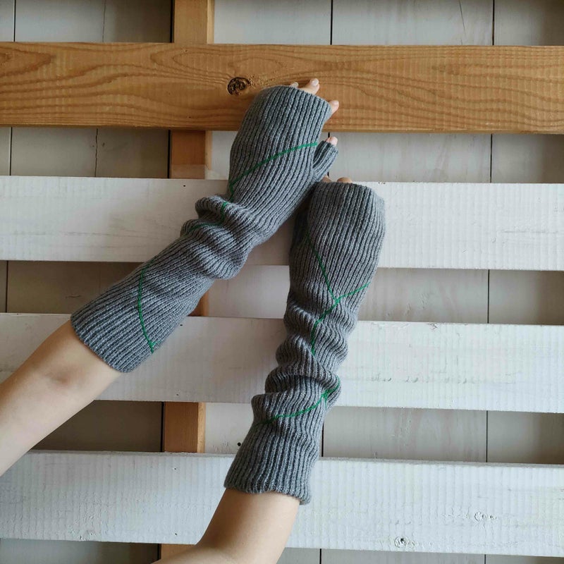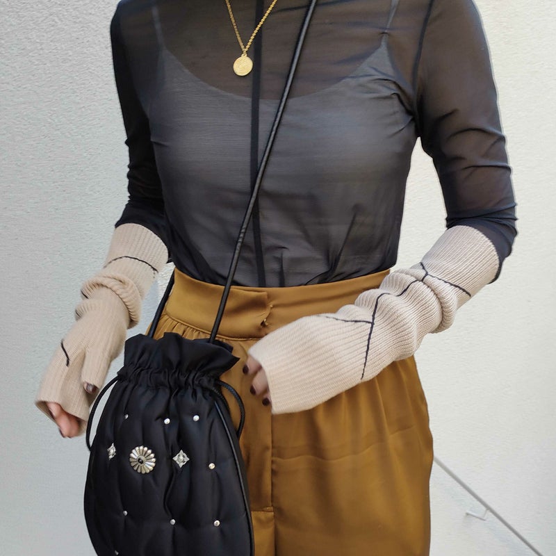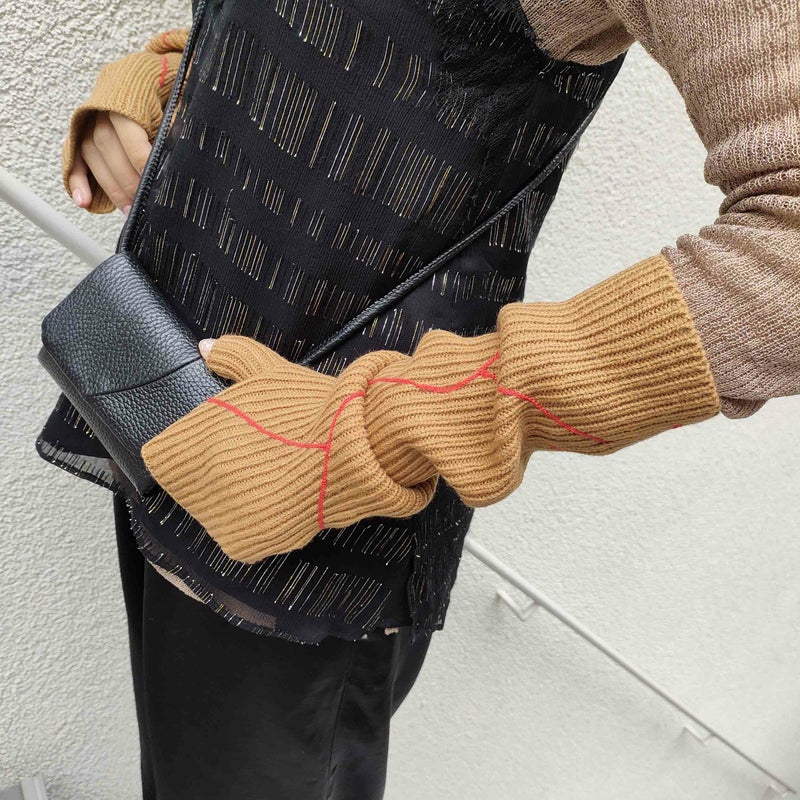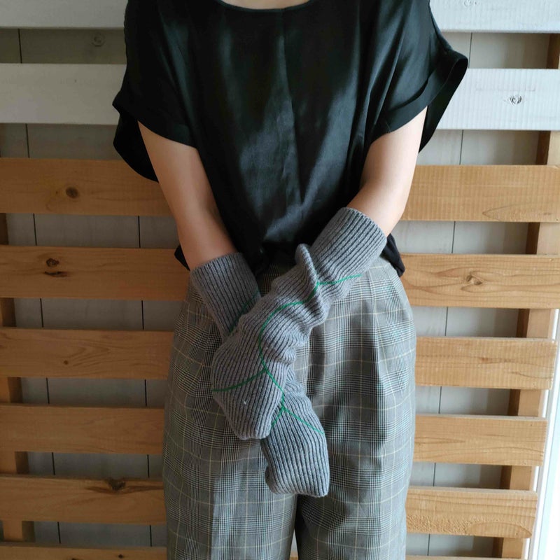 今期のトレンドで、イチオシのアームウォーマーです。 手の甲側にラインが入った指なしグローブで、リブ組織なので着用時の窮屈感はありません。 クシュっとさせて着用すると、ラインを可愛く出す事ができます。