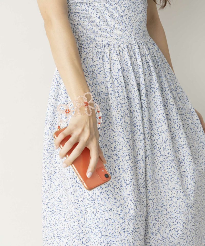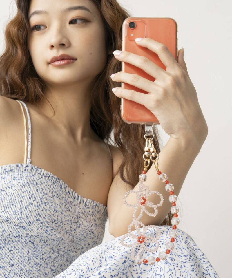 お花型に編んだビーズが可愛い、存在感のあるルックスで、手首に通すだけでワンポイントになるアイテム。 両手がふさがらずいつでもサッとスマホが操作が可能に。