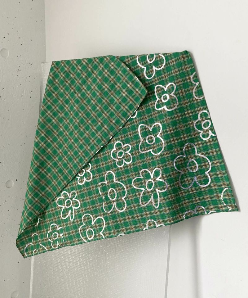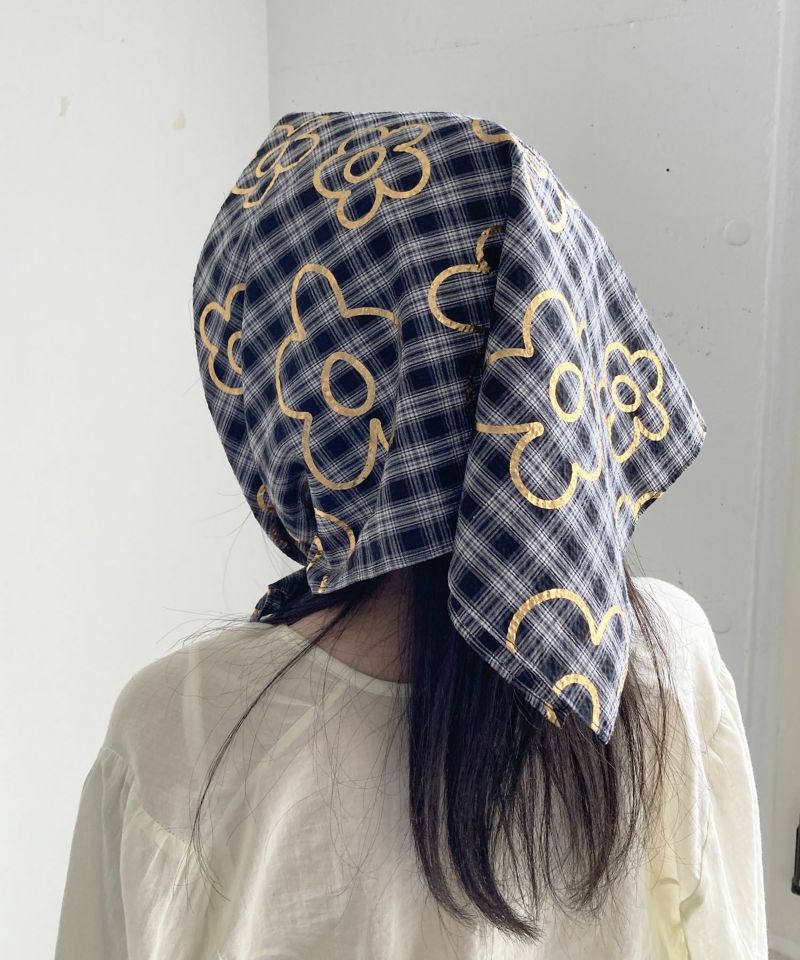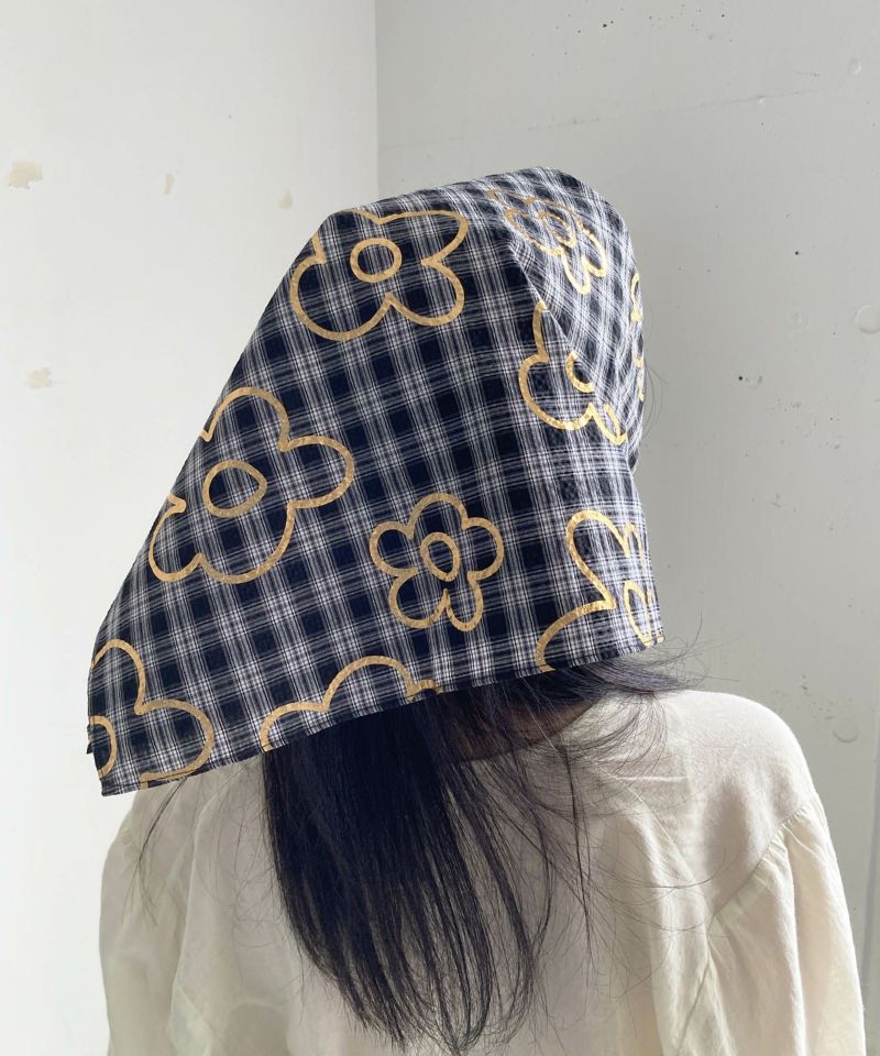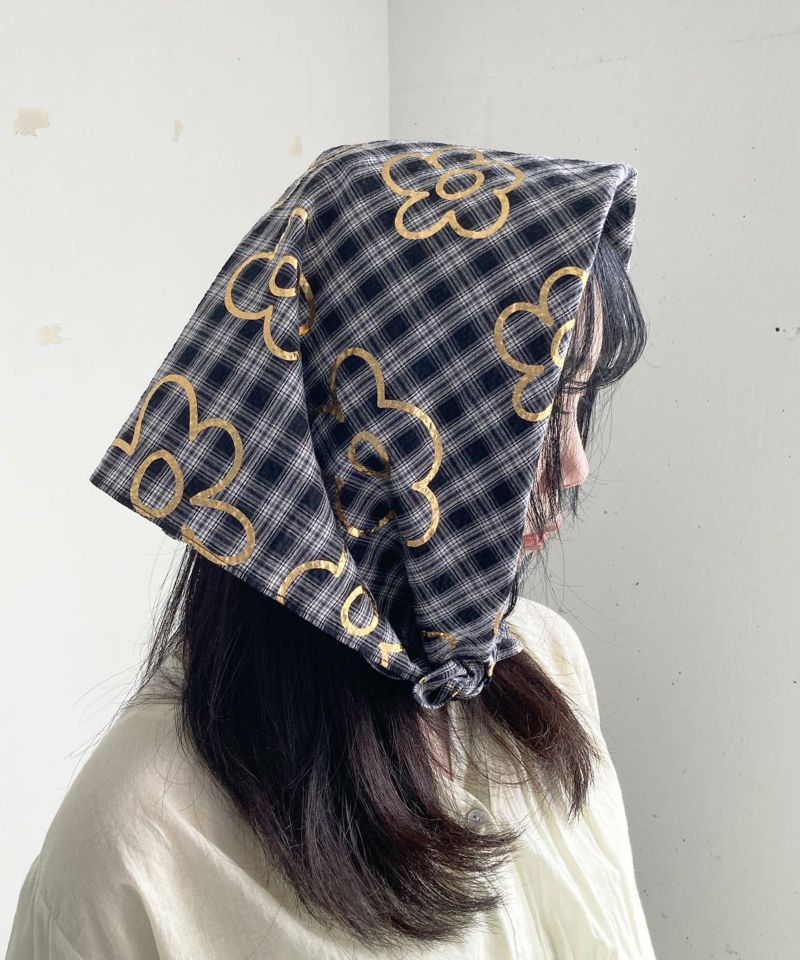 チェック生地の上に、落書きのようなテンションのお花柄を箔プリントしたスカーフ。 汗を吸ってくれる素材のため、2つに折ってキャップの上からかぶって日よけにしたり、首に巻いたり、ハンカチとして使用したりと、夏場の様々なシーンに使用可能です。 フェスやアウトドアなどのカジュアルなコーディネートへの合わせるのがおすすめです。 ※総柄のため、柄の入り方に個体差が生じます。