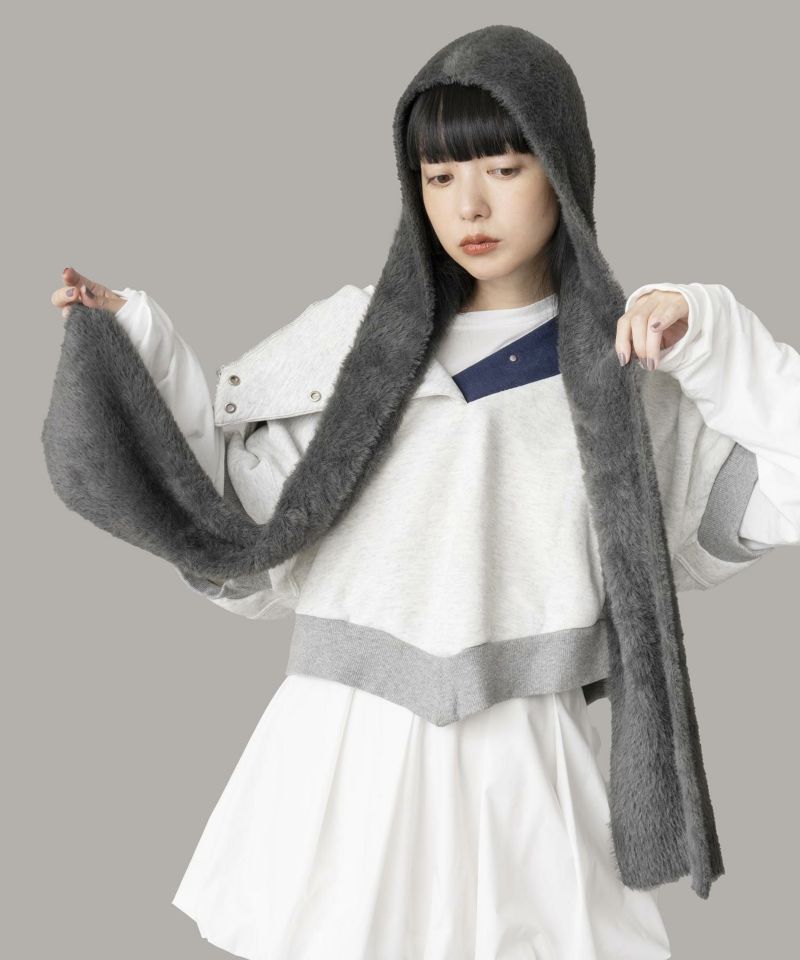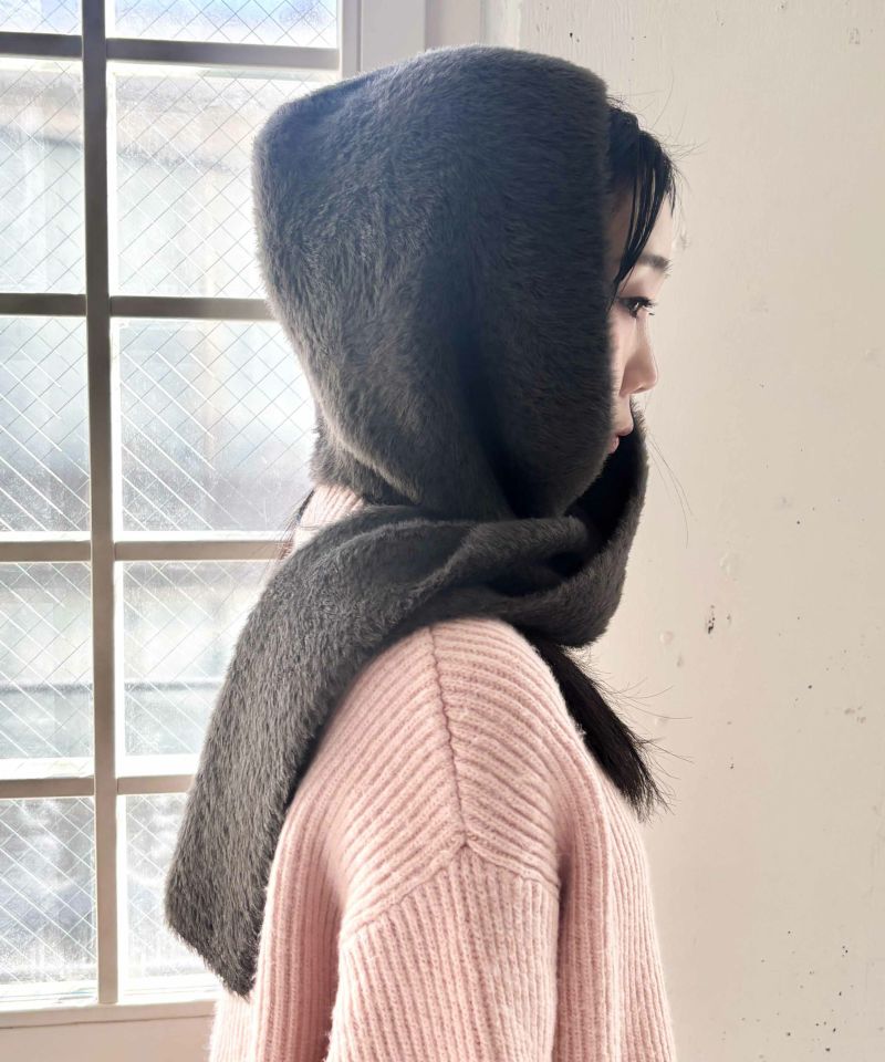 ふわふわとした肌触りの良い糸を使用したフード付きのマフラー。