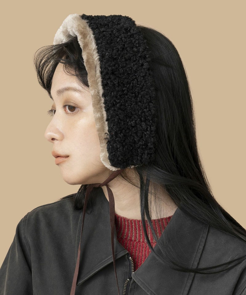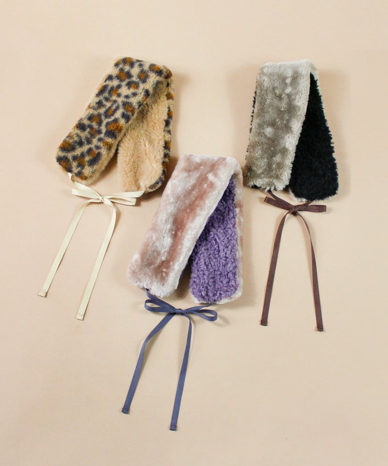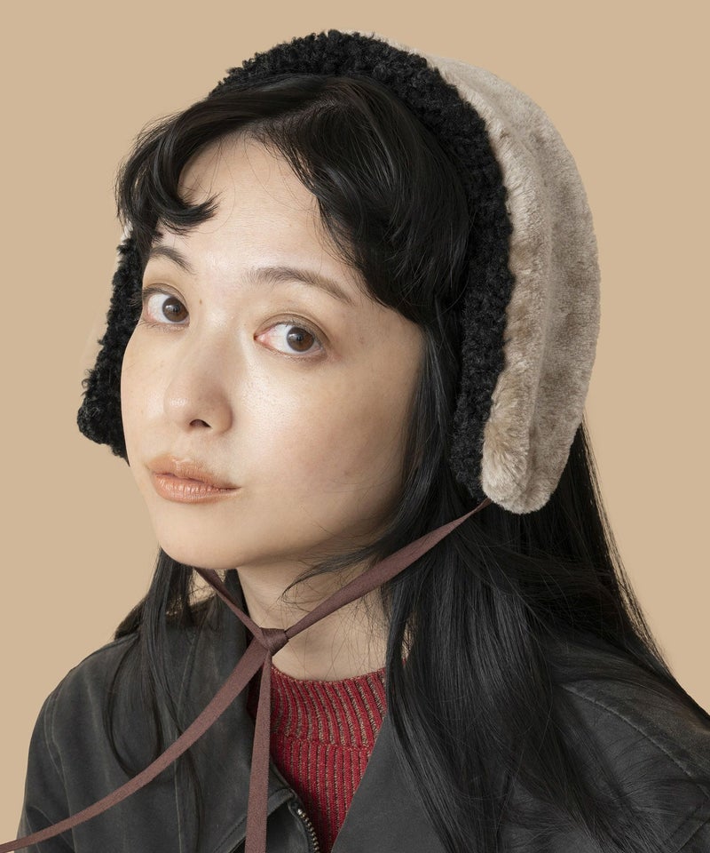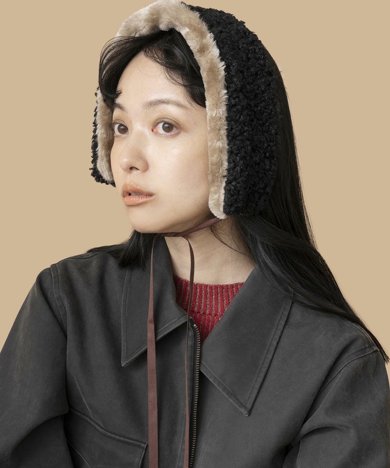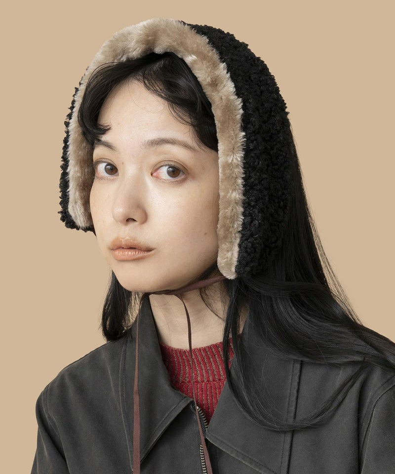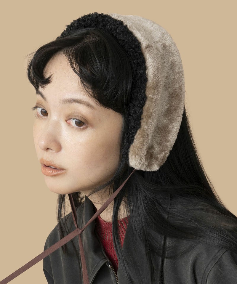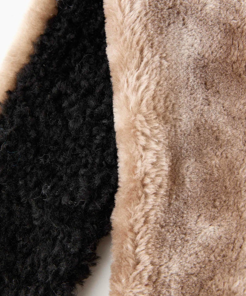 リバーシブルで使えるフェイクファーのマフは、シンプルながら計算されたパターンが特徴。