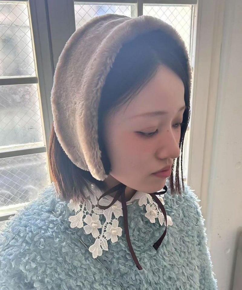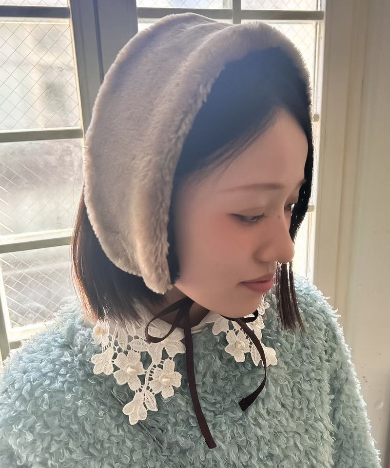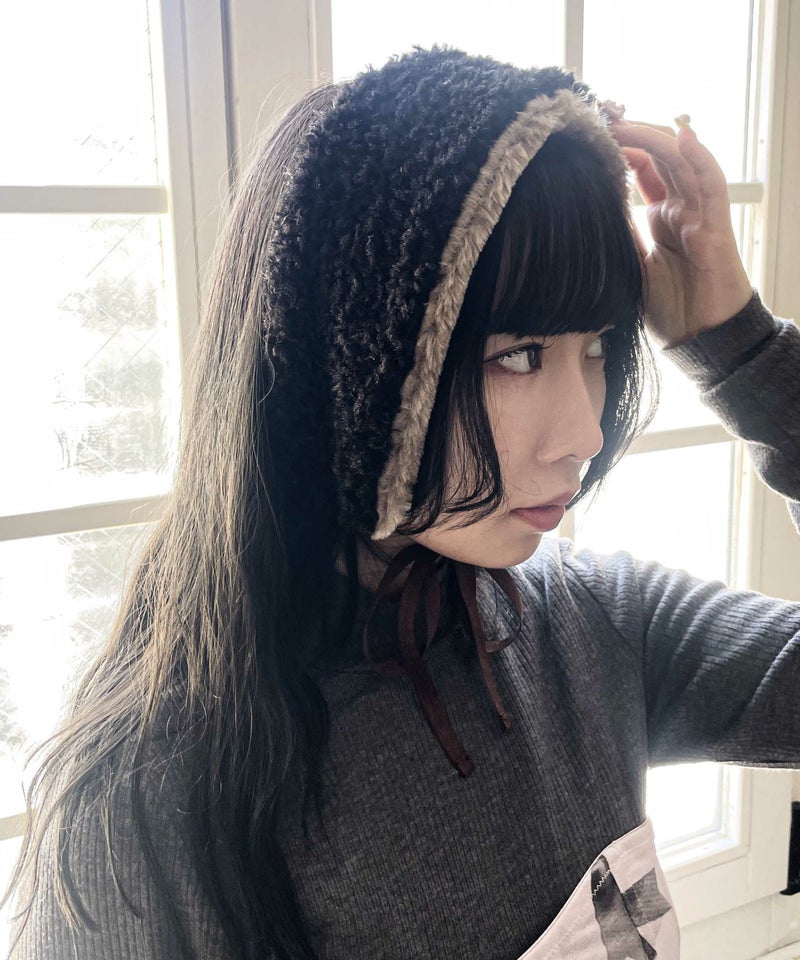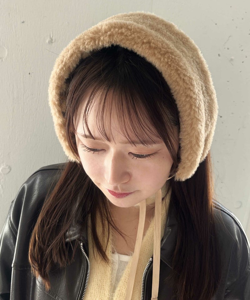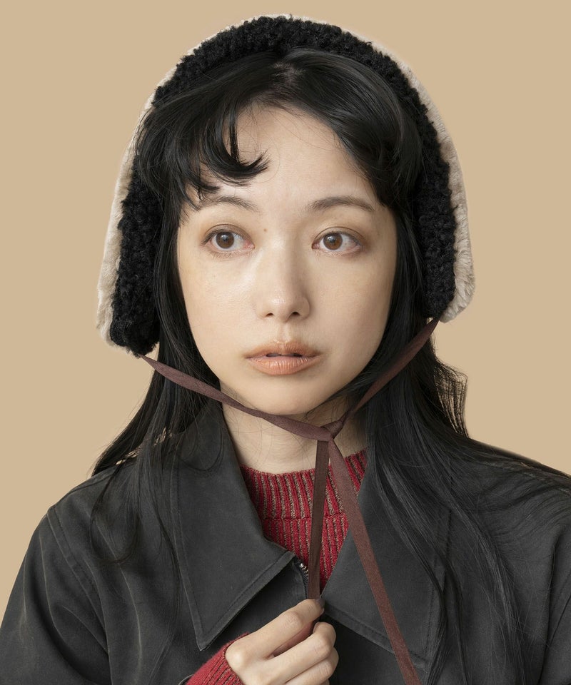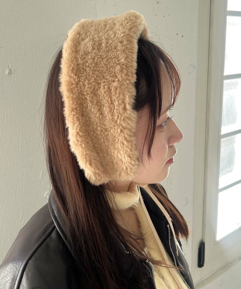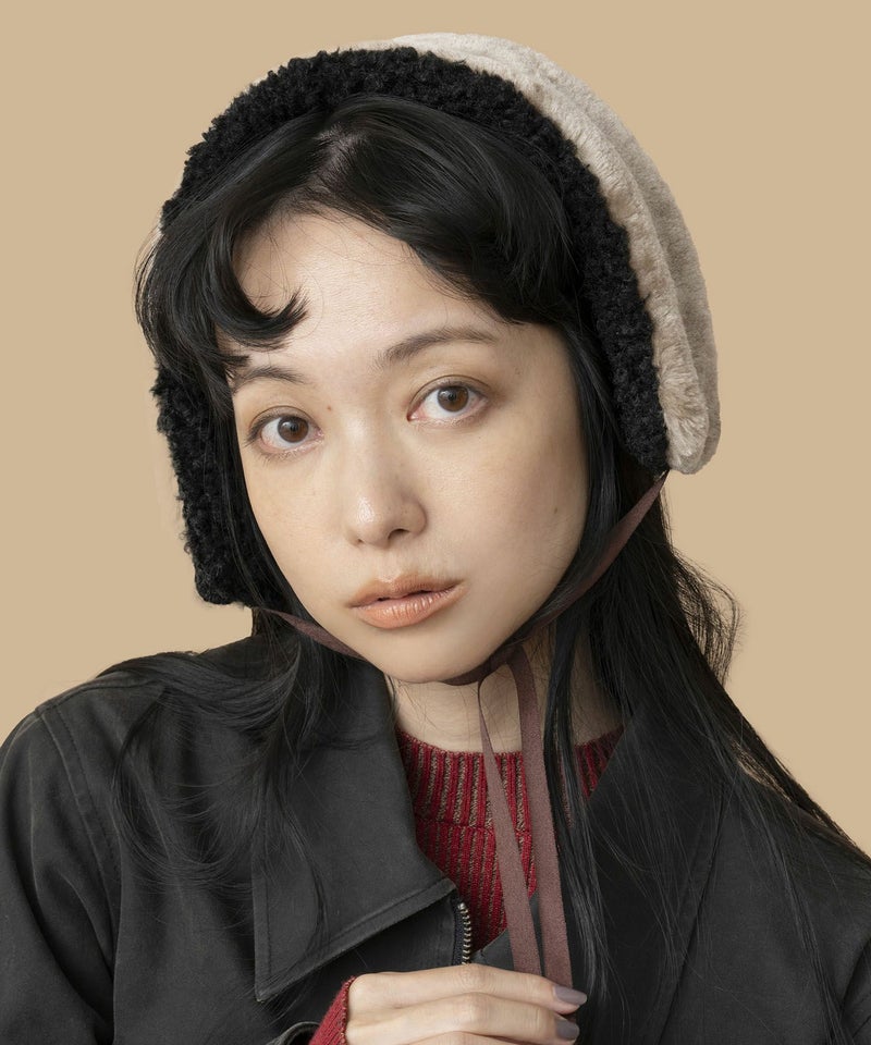 リバーシブルで使えるフェイクファーのマフは、シンプルながら計算されたパターンが特徴。