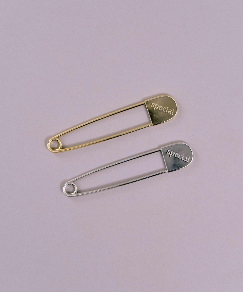 “special”ロゴが刻印されたビッグサイズのピンアクセサリー。 スタイリングのポイント使いやバッグチャーム、ストールピンにと、幅広く使えるスタイリングアイテムです。