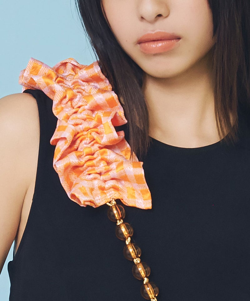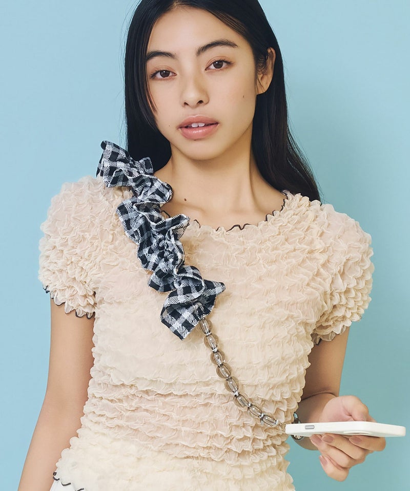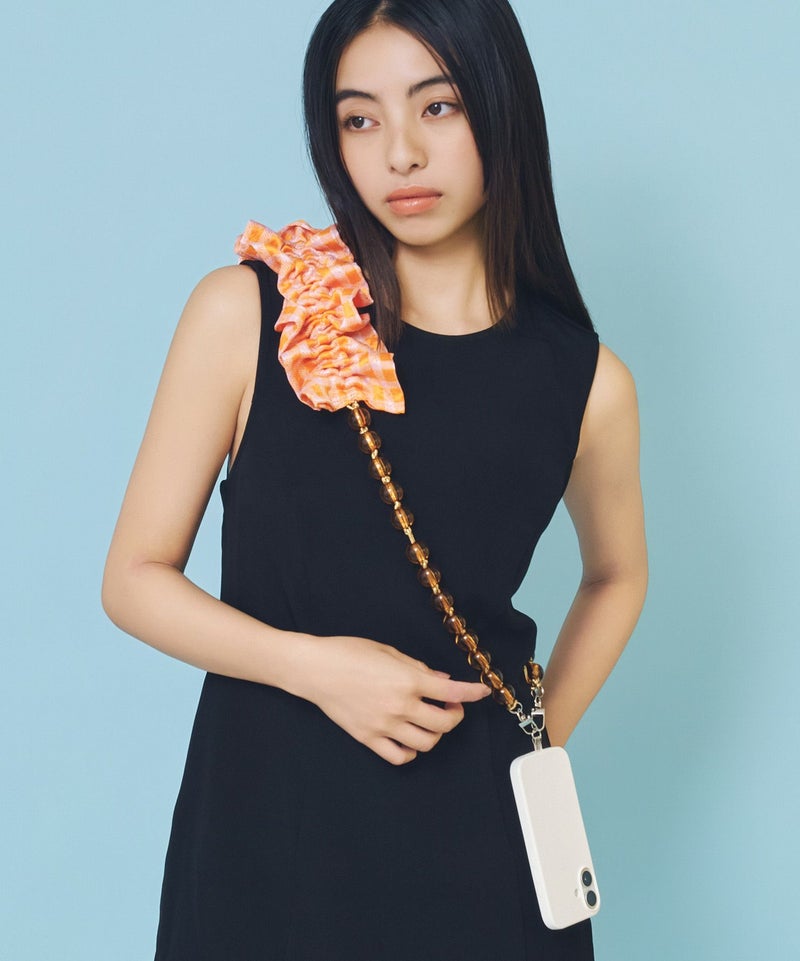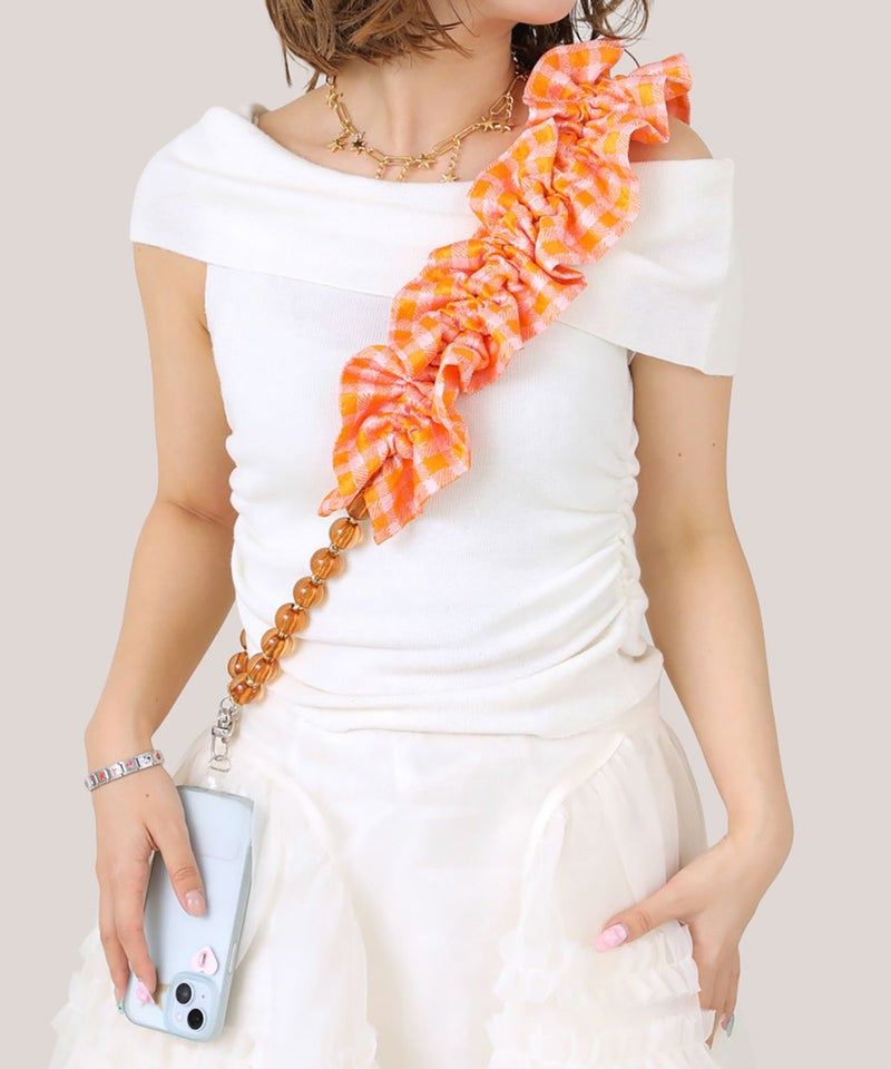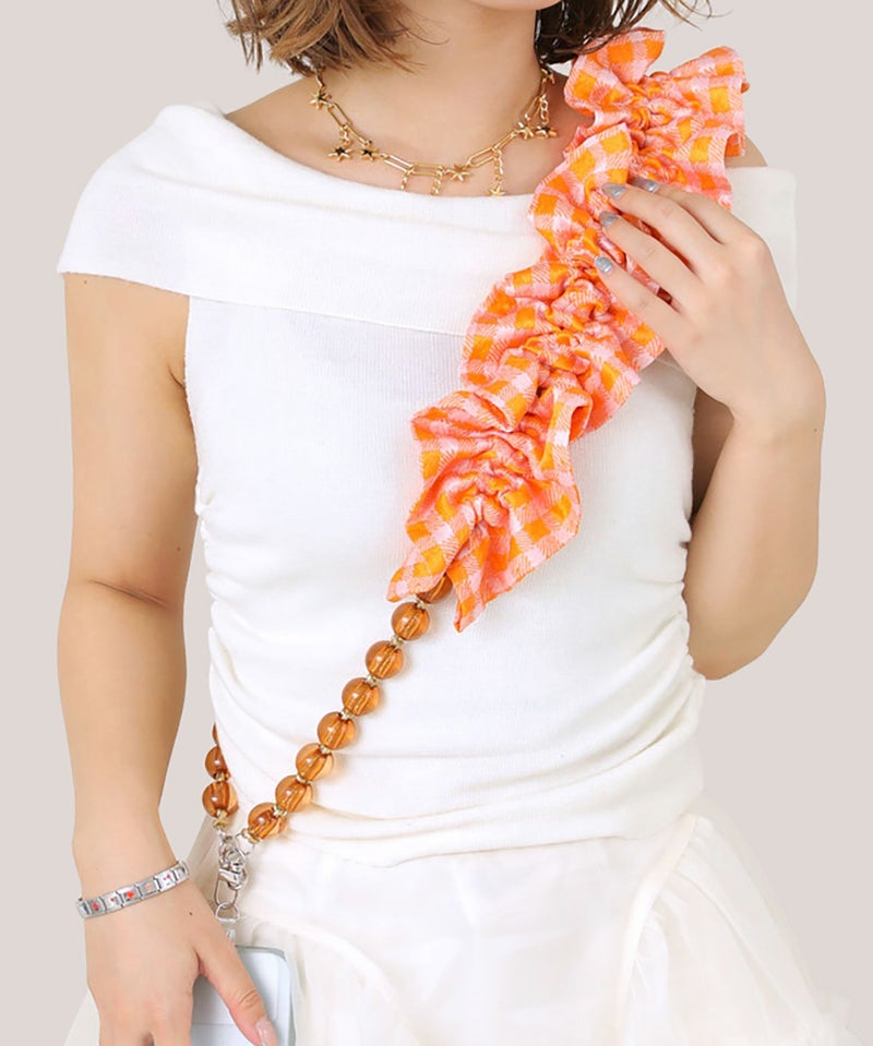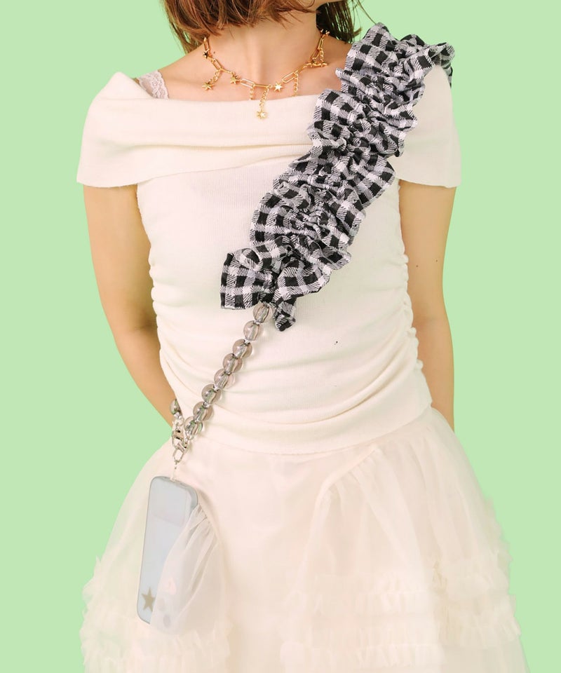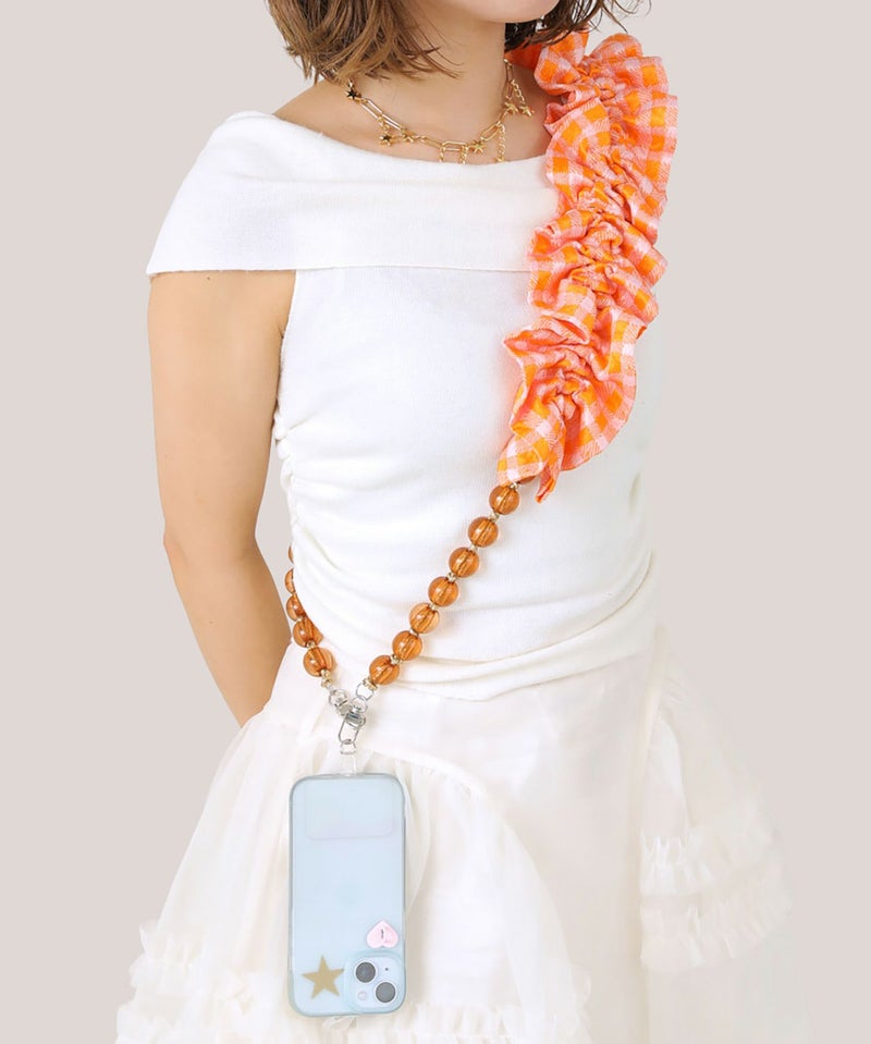 チェック柄のフリル生地と、ビーズの組み合わせが可愛いスマホショルダー。
