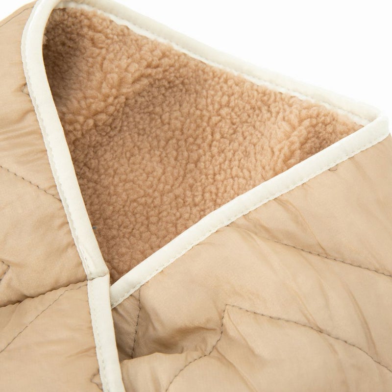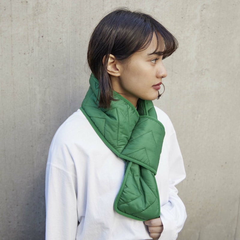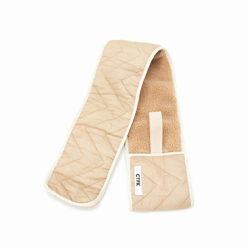 ジグザグのキルティングに裏がボアになった差し込みタイプのティペット。 ボア面を上にしてくるくるすると、ゴムでコンパクトにまとめられて持ち運びも便利です。