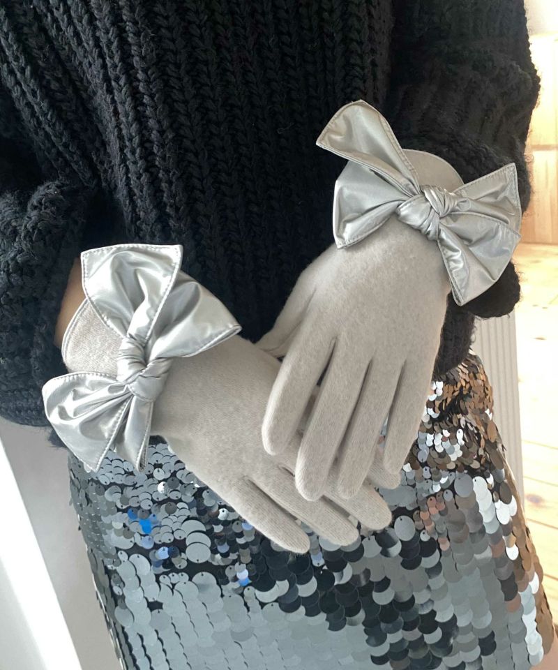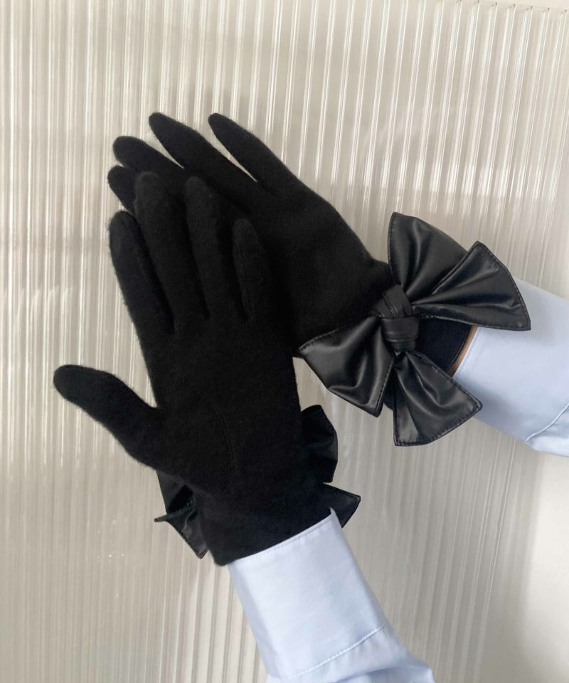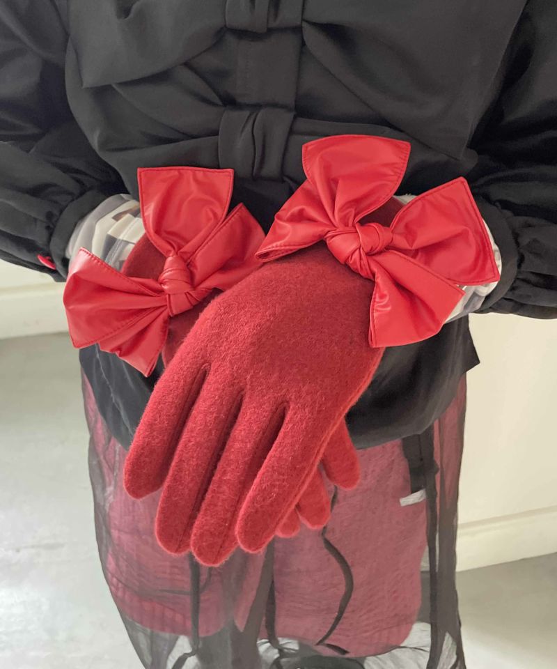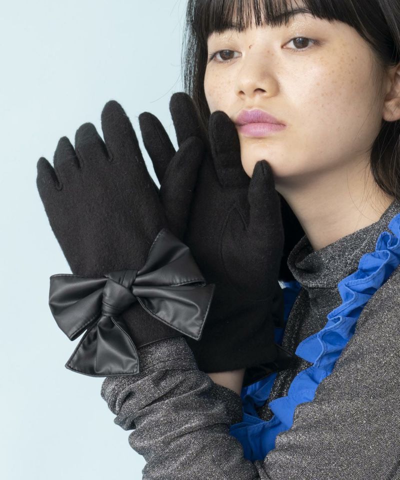 本体は肌触りの良いニット素材を使用しています。 指に隙間なくフィットし、手を温めてくれます。 リボン部分はとても薄くて軽い合皮素材を使用し、甘くなりすぎないノットデザインのリボンに仕上げているのが一番のポイントです。 親指と人差し指にスマホ操作対応可能な刺繍を入れています。 大きな手元のリボンがシンプルになりがちな冬のコーディネートのアクセントになること間違いなしです。