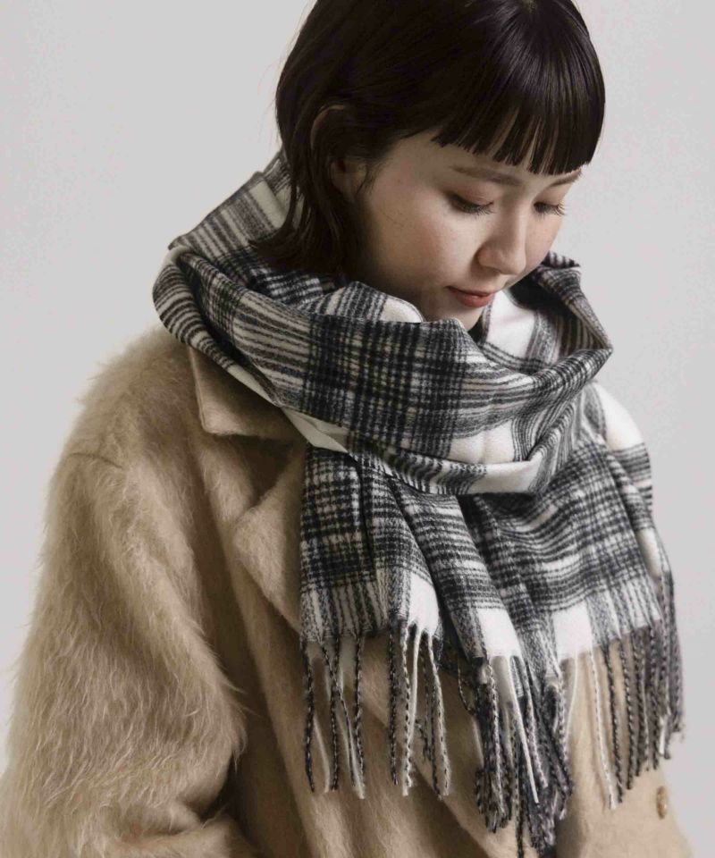 肌触りのいいアクリルのストール。フェミニンな印象のチェックを使用し、合わせやすいデザインにしています。