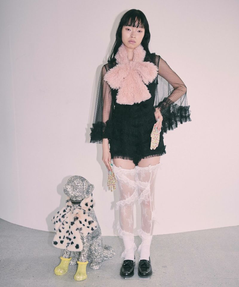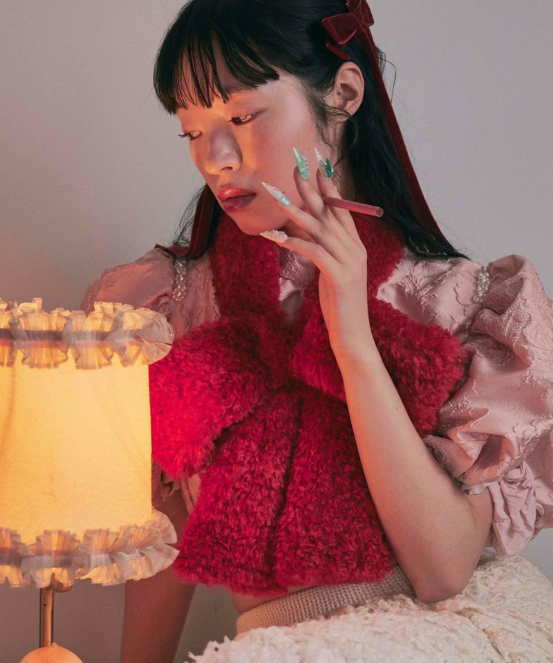 かわいすぎるコーディネートには少し抵抗があったので、アウターになじむ同系色のリボンティペットを選びました。