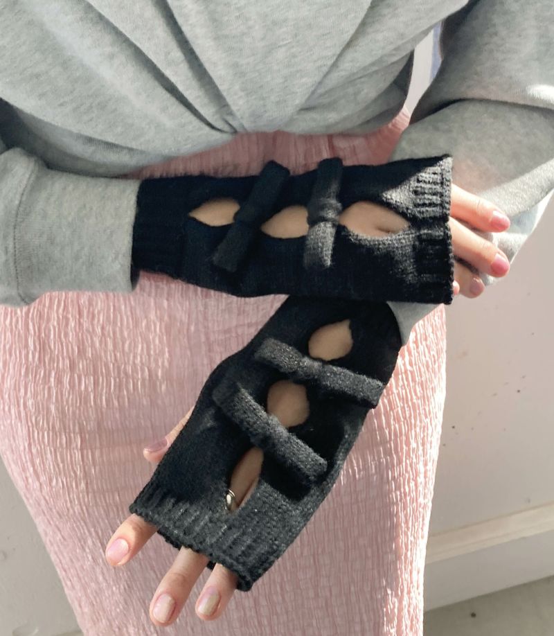 リボンニットとグローブを重ねてつけても、リボンニットだけをアームウォーマーのようにつけても◎