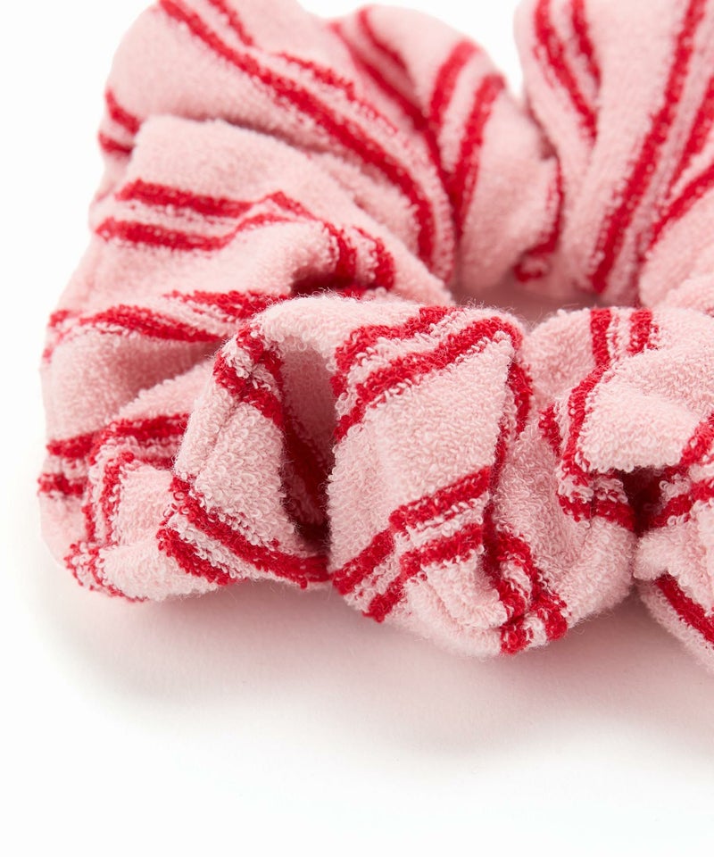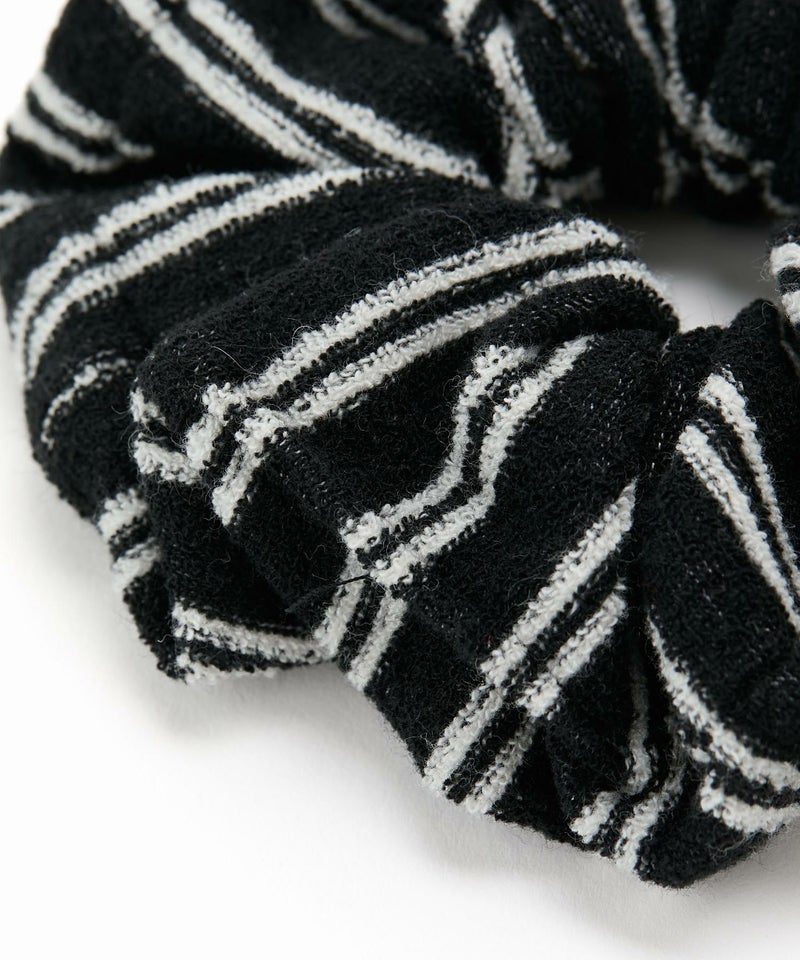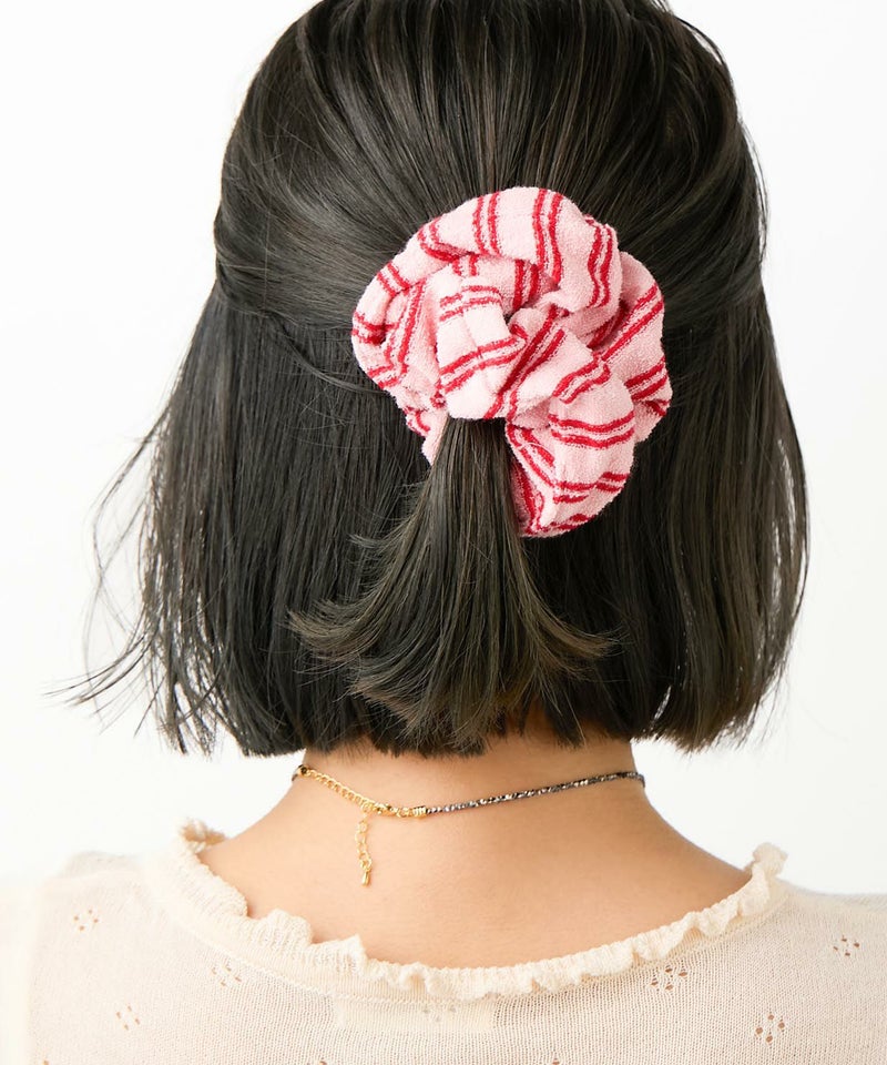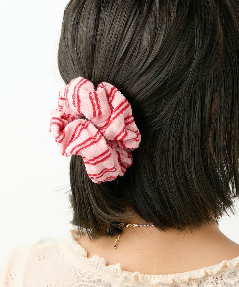 肌触りのいいパイル素材のシュシュ。 スタイリッシュなストライプ柄で、まとめ髪のアクセントにはもちろん、手元に添えるだけでもこなれた印象に。 甘めからカジュアル合わせ等、普段のスタイリングに取り入れやすいアイテム。