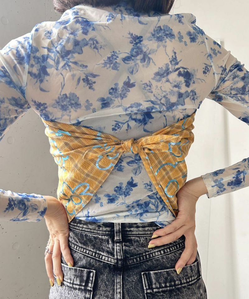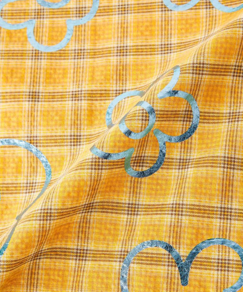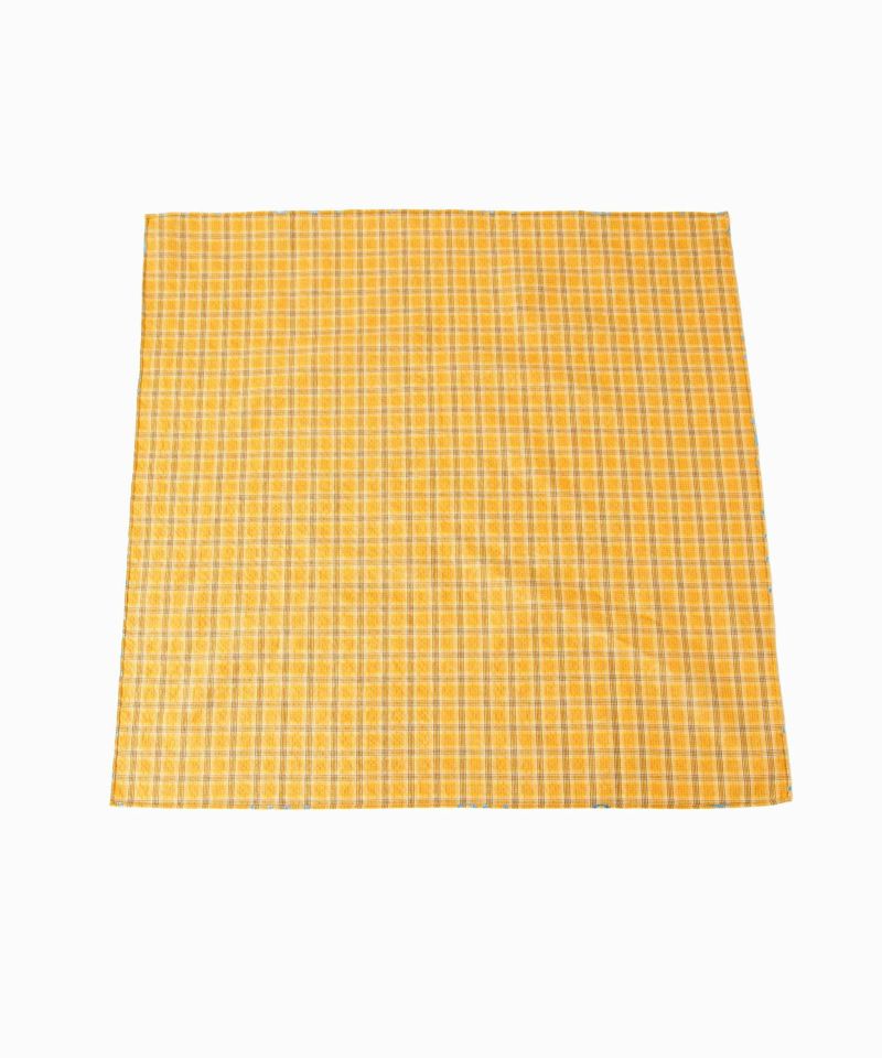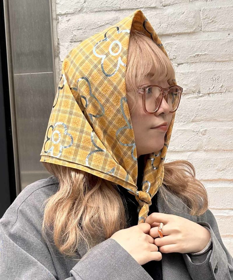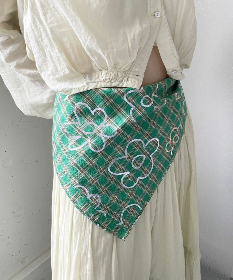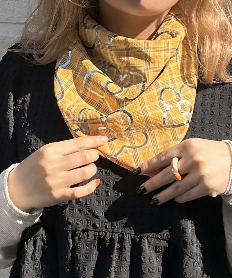 チェック生地の上に、落書きのようなテンションのお花柄を箔プリントしたスカーフ。 汗を吸ってくれる素材のため、2つに折ってキャップの上からかぶって日よけにしたり、首に巻いたり、ハンカチとして使用したりと、夏場の様々なシーンに使用可能です。 フェスやアウトドアなどのカジュアルなコーディネートへの合わせるのがおすすめです。 ※総柄のため、柄の入り方に個体差が生じます。