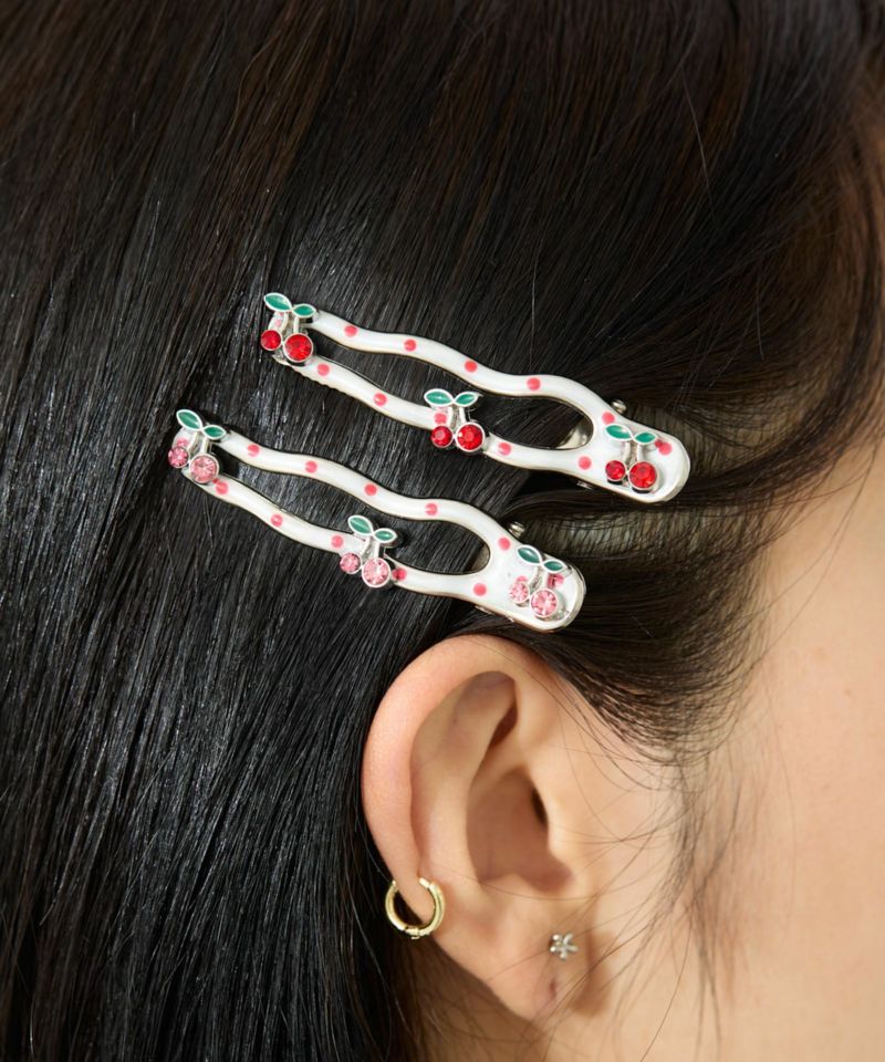 さくらんぼ&ドットの組み合わせが可愛いヘアクリップ。 白をベースにしているためどんな洋服にも合わせやすく、他のヘアクリップと組み合わせがしやすい。 レッドとピンクの2個セットです。