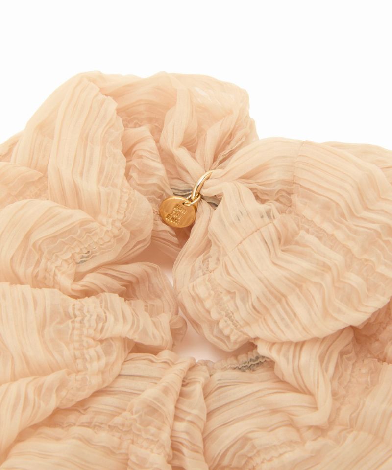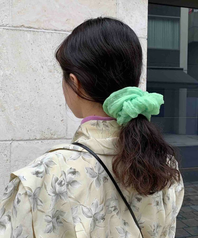 ちょこんと付いたブランドのネームチャームがシュシュのボリュームを際立たせます。