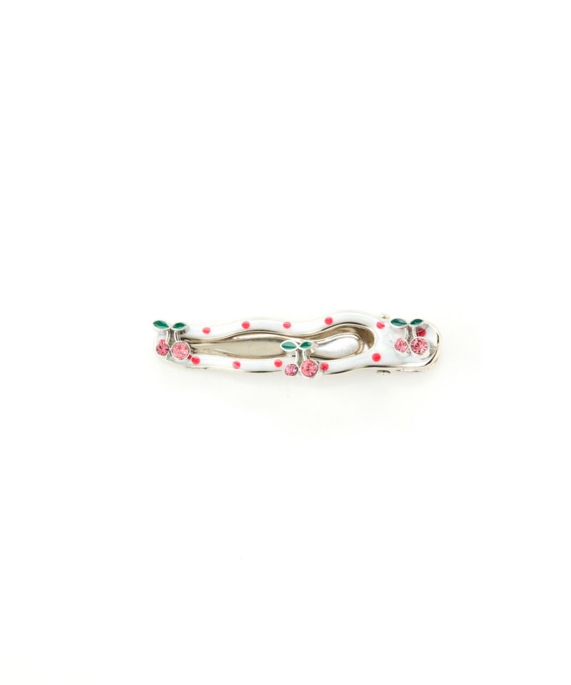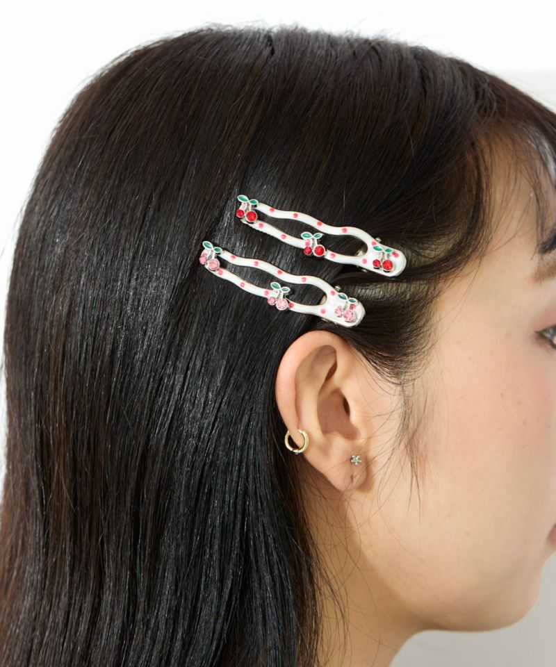 さくらんぼ&ドットの組み合わせが可愛いヘアクリップ。 白をベースにしているためどんな洋服にも合わせやすく、他のヘアクリップと組み合わせがしやすい。 レッドとピンクの2個セットです。