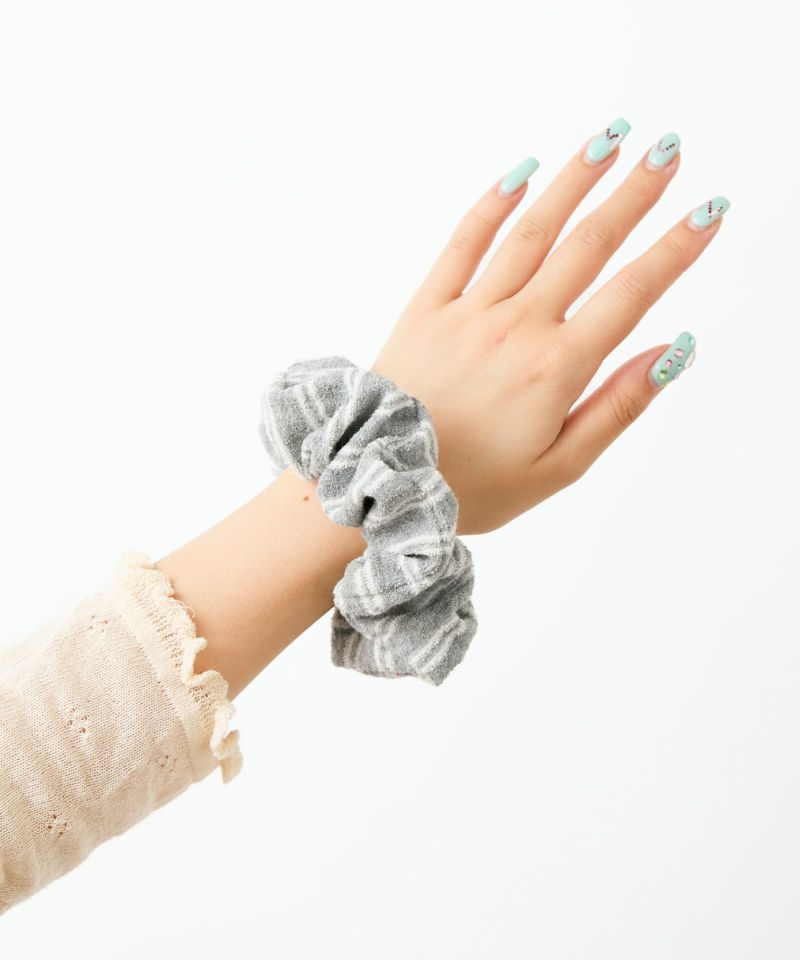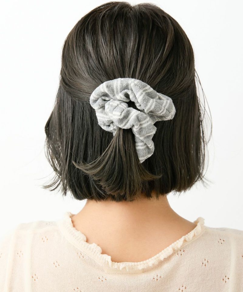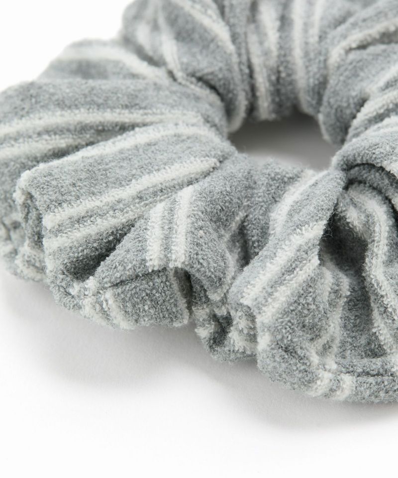 肌触りのいいパイル素材のシュシュ。 スタイリッシュなストライプ柄で、まとめ髪のアクセントにはもちろん、手元に添えるだけでもこなれた印象に。 甘めからカジュアル合わせ等、普段のスタイリングに取り入れやすいアイテム。