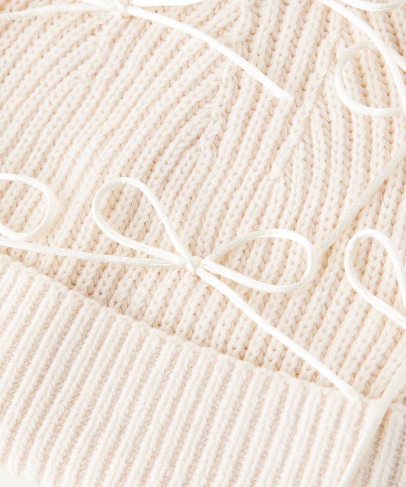 つやっと可愛いリボンがたくさんついたワッチ。 ワッチ本体のコットン素材とのMIX感により、カジュアルにかぶっていただけます。 編地をゆるめにしているので、暑い日でも着用していただけます。