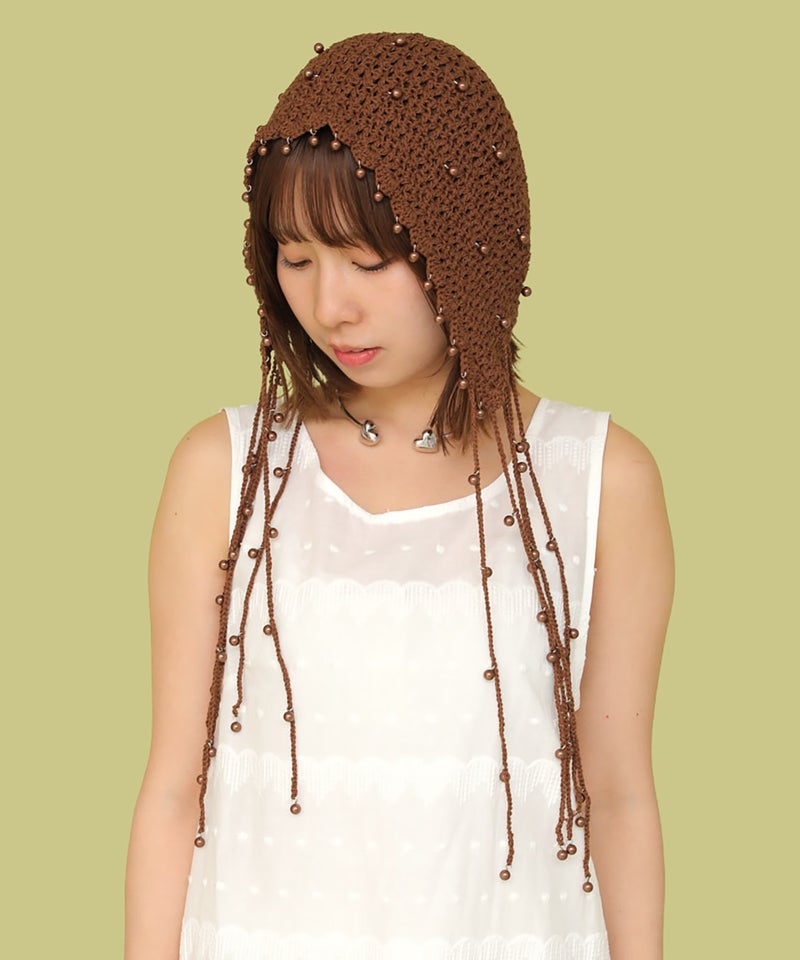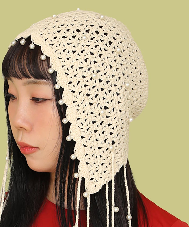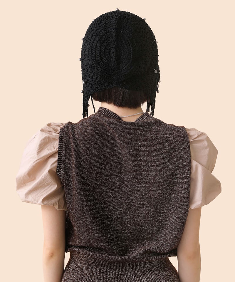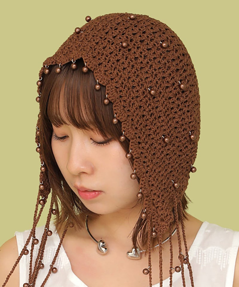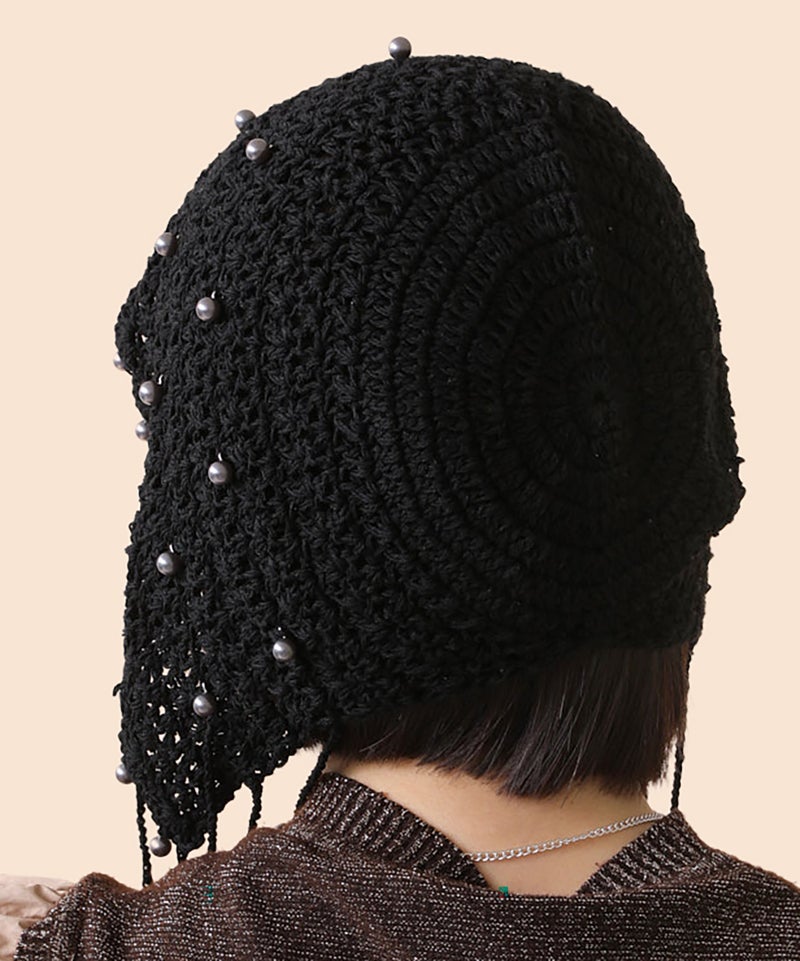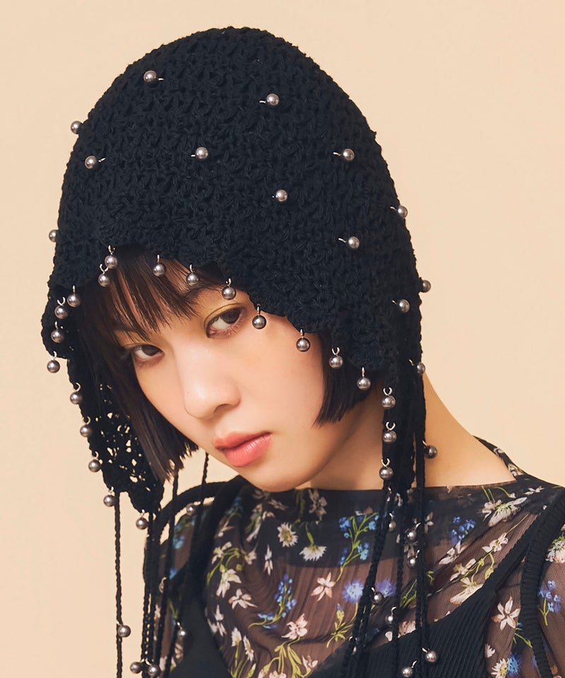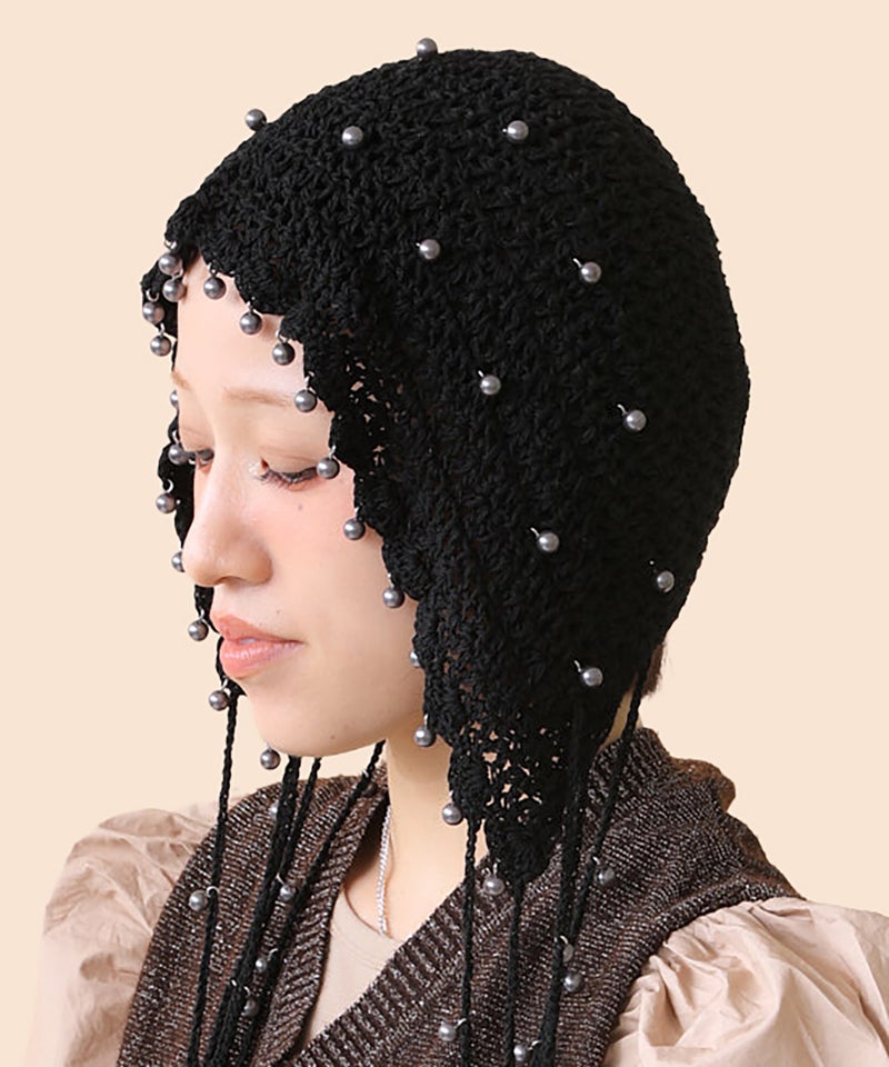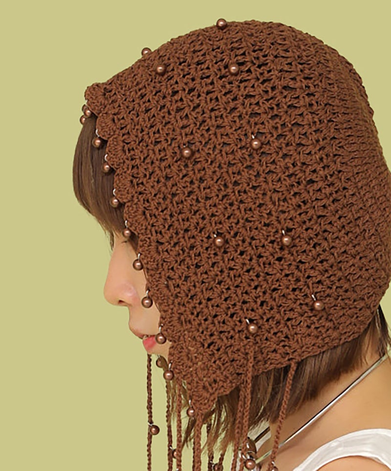 夏らしい透かし編みの本体に、一つ一つ金具でビーズを付けたアートピースのようなアイテムです。